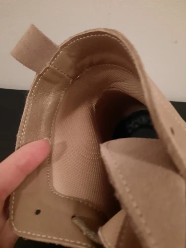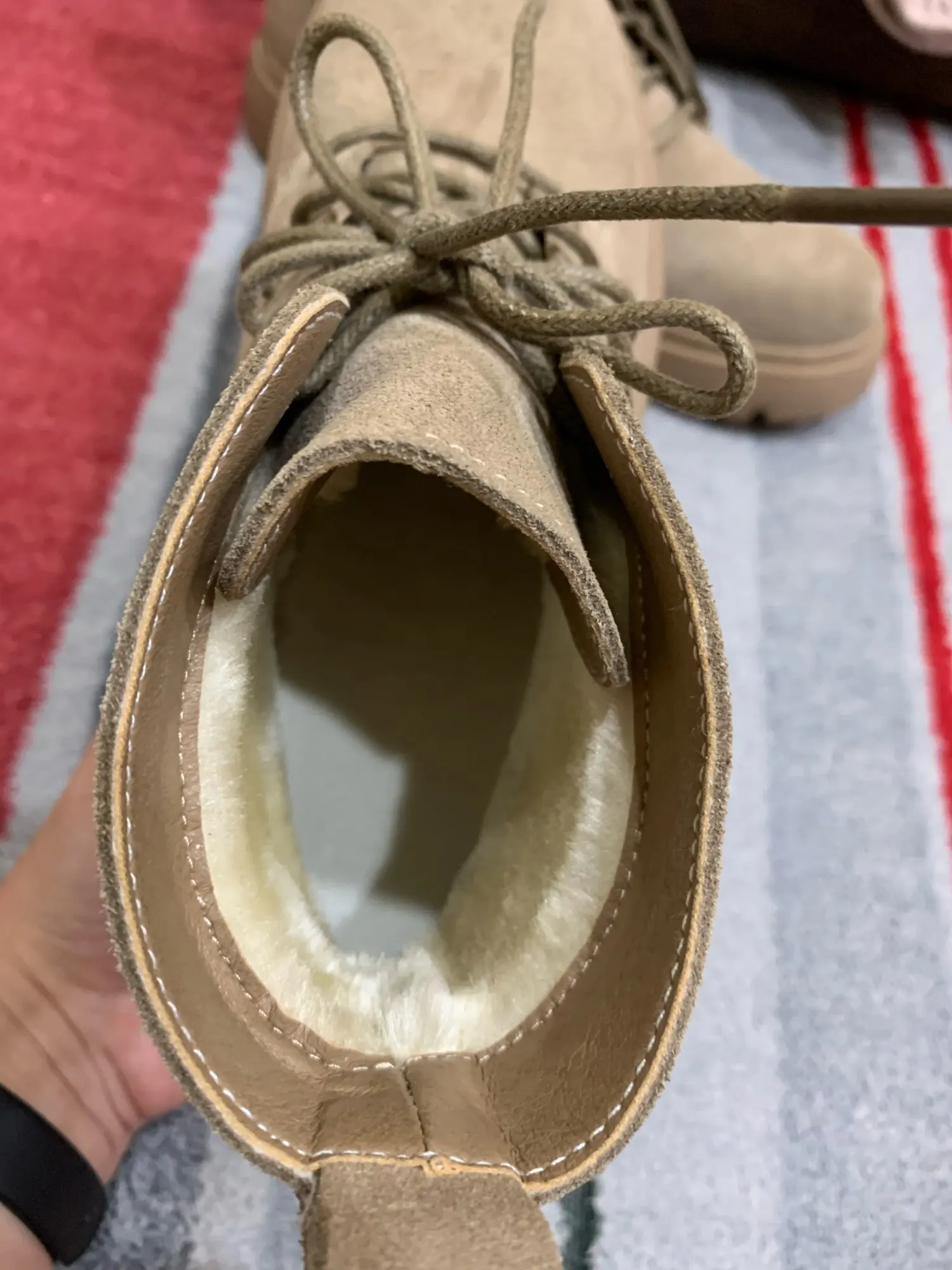 Ботинки соответствуют фото. Аккуратные, симметричные, швы и строчки ровные. Запах клея убийственный. Цвет приятный песочно бежевый, без желтизны. На носке "замша" более гладкая, чем на боковой части Некоторые сомнения в натуральности есть: хлятик на пятке имеет тканевую изнанку. Но может это просто уплотнили так китайцы. Мех искусственный, но плотный. Не лезет. В подарок получила беленькие носочки. На 39 полный русский + широкая стопа взяла 40 китайский. На подошве размер 25/1.5