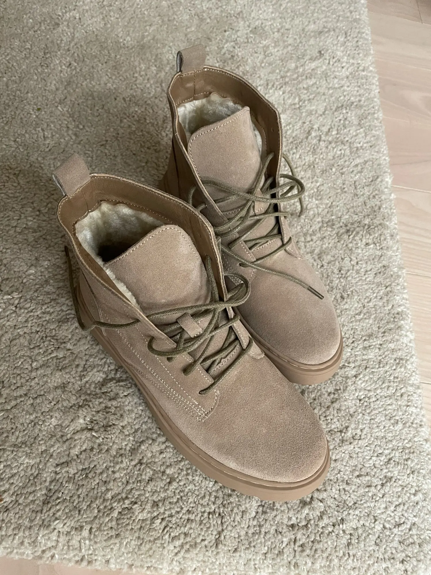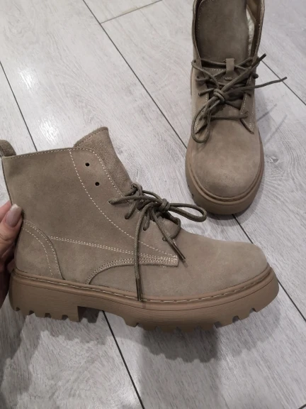 Отличные ботинки, замша натуральная, отличного качества. Цвет бежевый. Мех внутри искусственный. Очень хорошо упакованы. При вскрытие был жуткий жапах. Ночь на балконе и запаха нет, пахнеш натуральной замшей( приятно). Ношу в жизни 37 размер, по стельке 24 см, заказала по сетке продавца 38. Подошли идеально. Даже с учётом меха. Нигде не жмёт и не давит. Очень рекомендую. Правда пришли с небольшим браком. Это видно на последнем фото, как будто чем то припалено, не критично, но не приятно. Замша то светлая. Открыла небольшой спор. Думаю будет в мою пользу. Заказывайте, не пожалеете. Магазину и продавцу спасибо за хороший товар