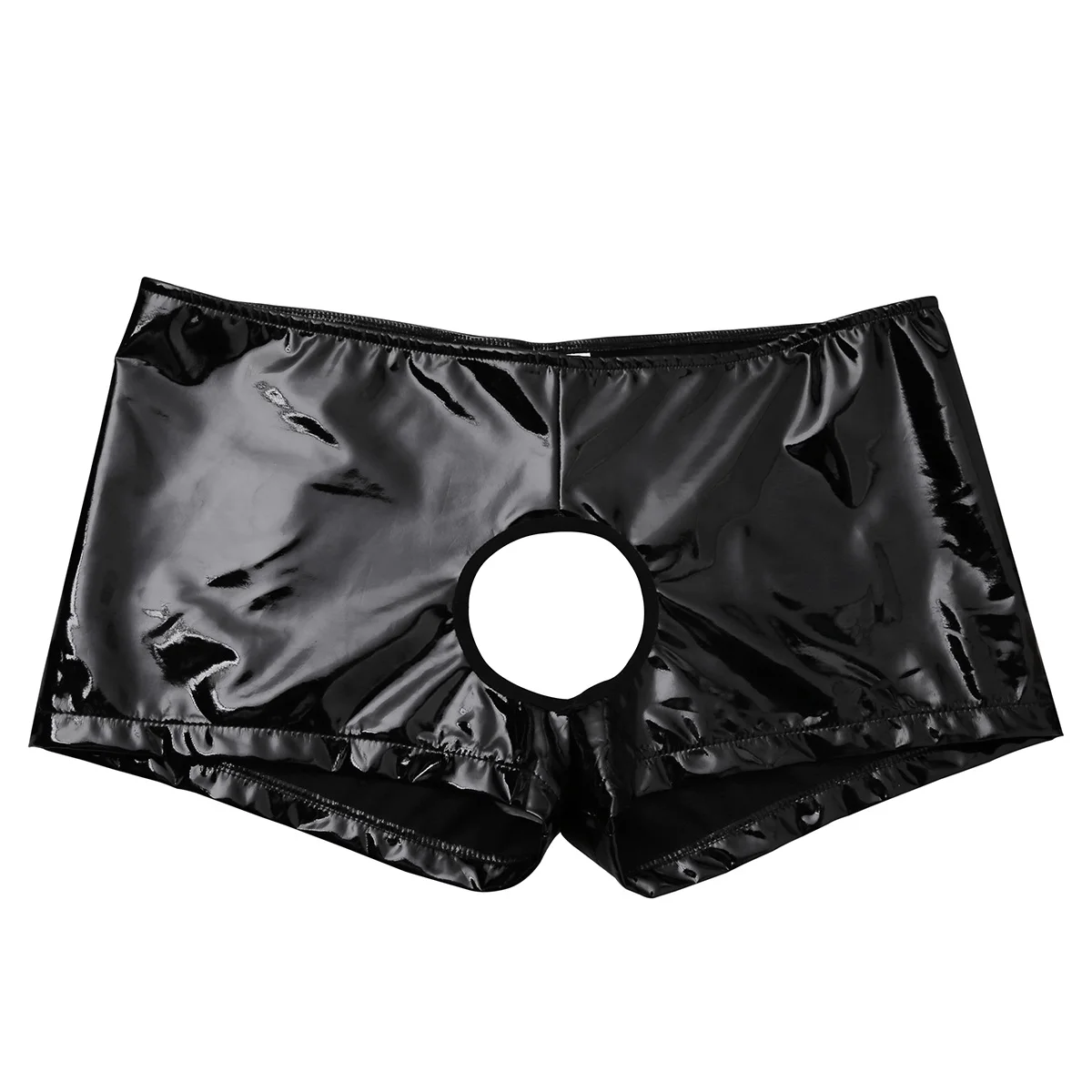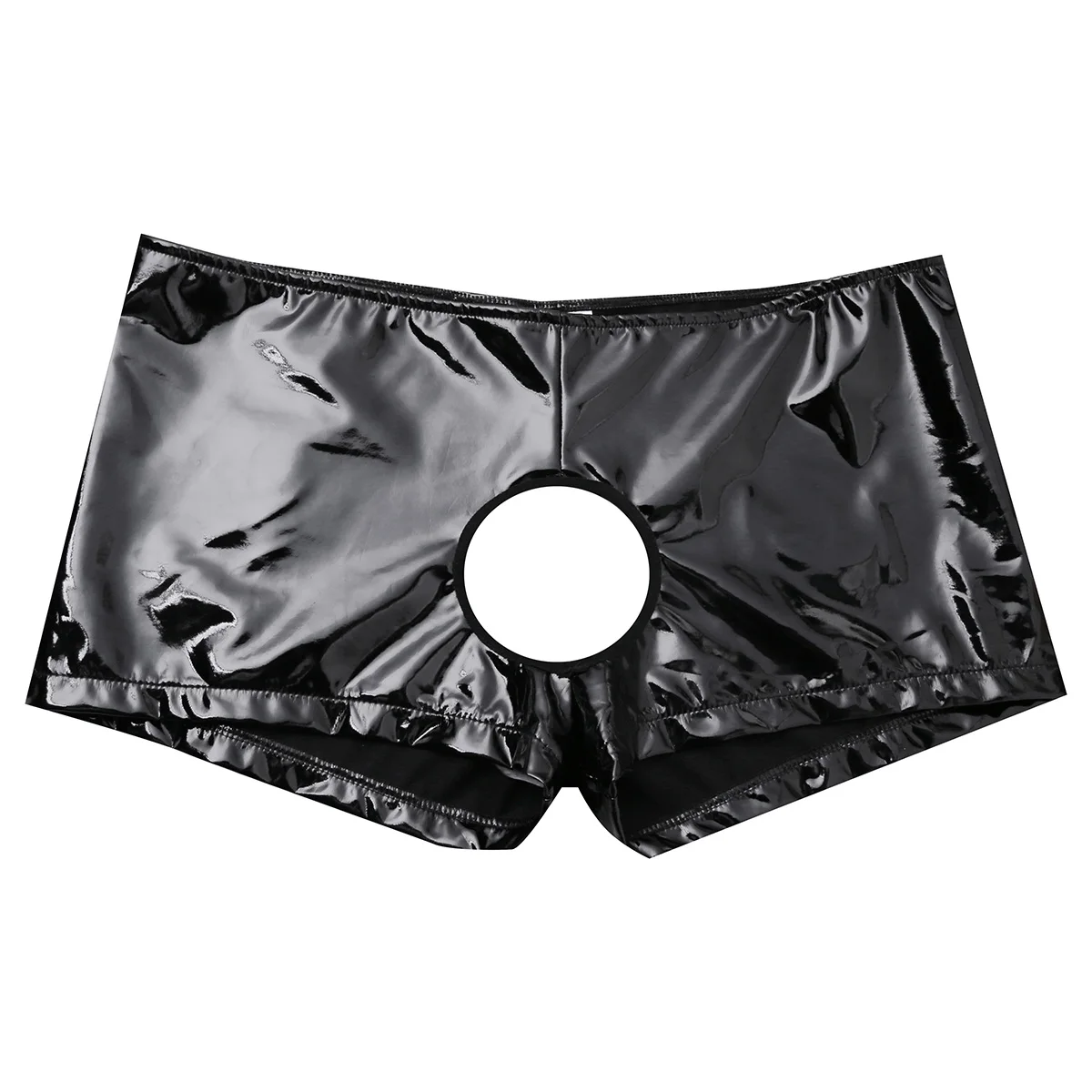Мужские трусы-боксеры с открытым отверстием для пениса, Трусы из лакированной кожи с открытым шаговым швом, сексуальные трусы-боксеры с вырезами и открытым задником, трусы-боксеры с низкой посадкой, Клубная одежда, латексные трусы, нижнее белье, шорты