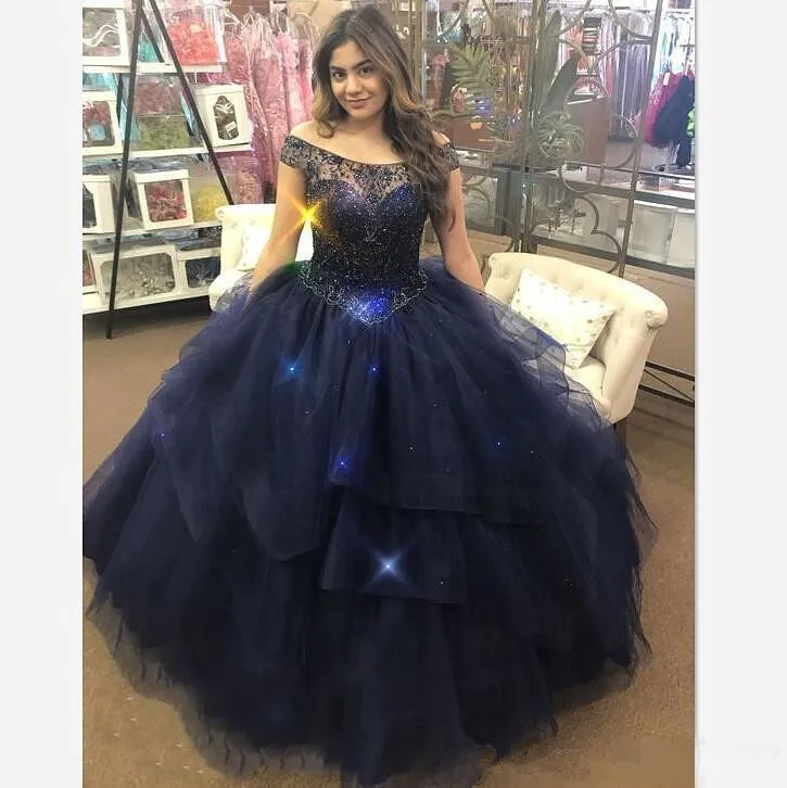 Темно-синие пышные платья, Пышное Бальное Платье с многоярусными оборками, бальное платье с блестками, бусинами, блестками, милое платье 16 дюймов для выпускного вечера для девочек