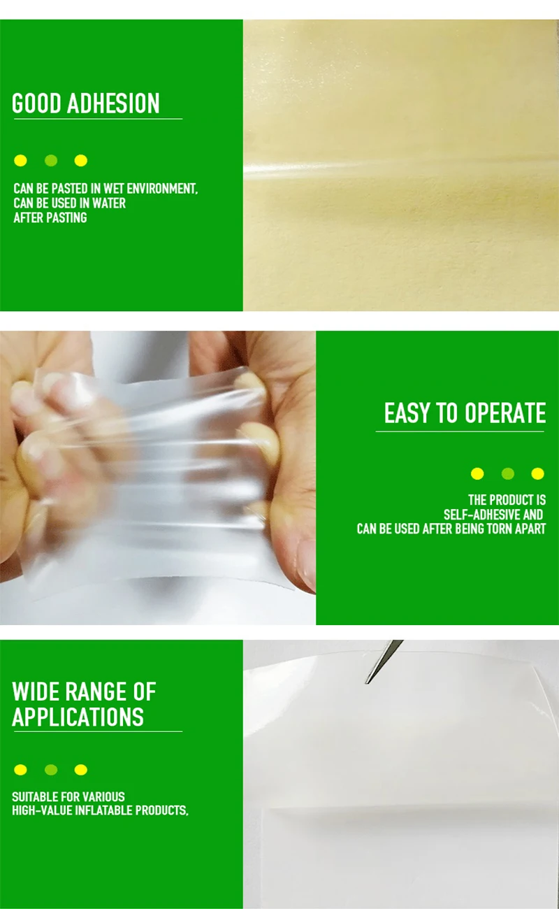 1. Для ремонта надувных лодок, подходит для всех типов высокоценных надувных продуктов, таких как воздушные матрасы, надувные лодки, батуты, надувные диваны, плавательные кольца, пляжные шары и т. д.