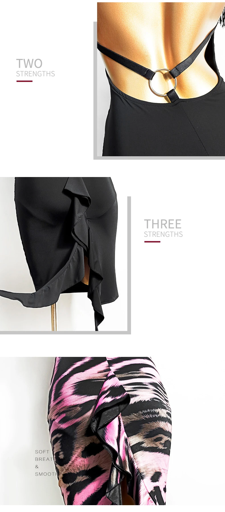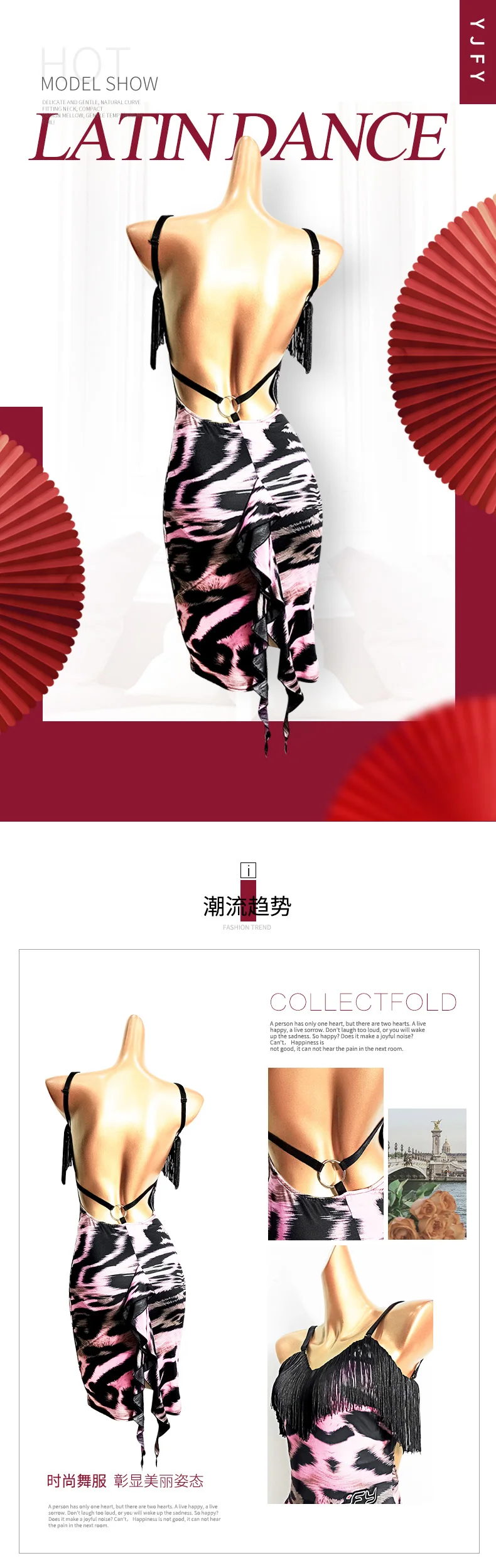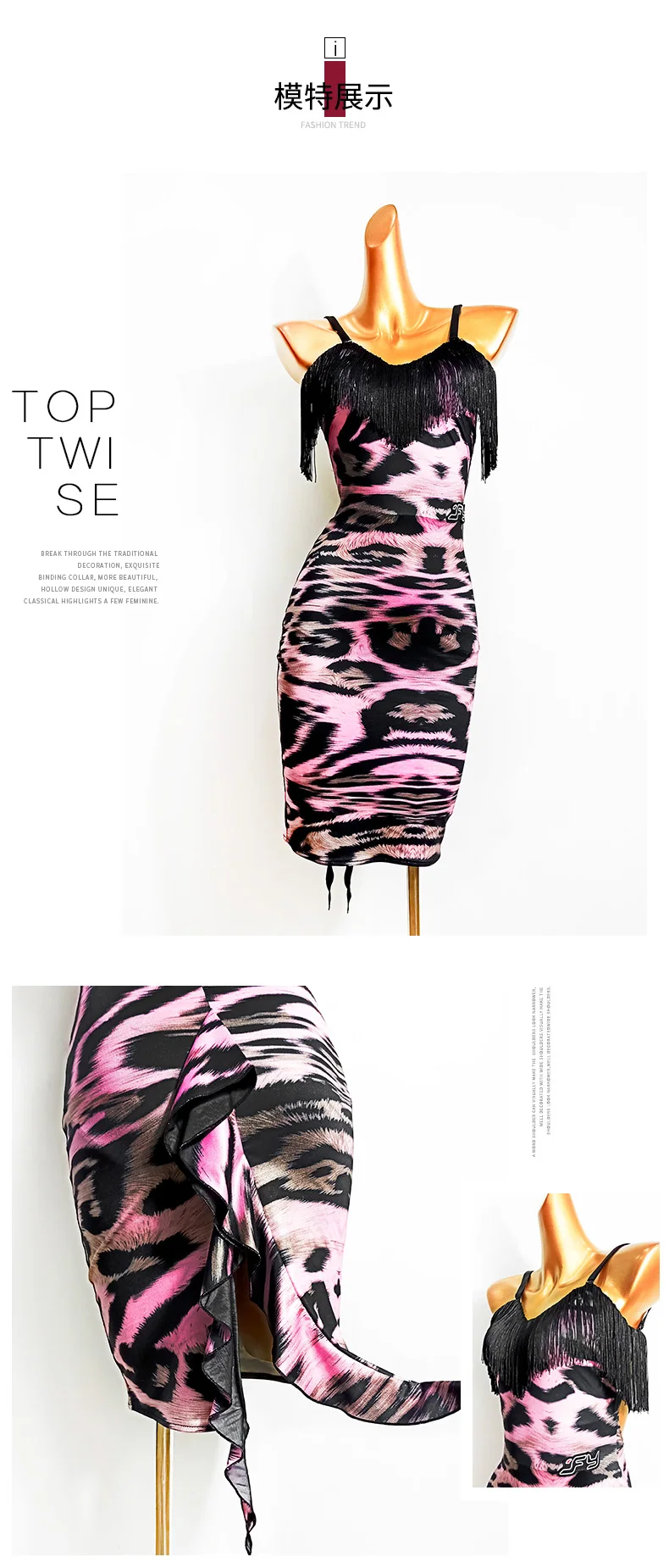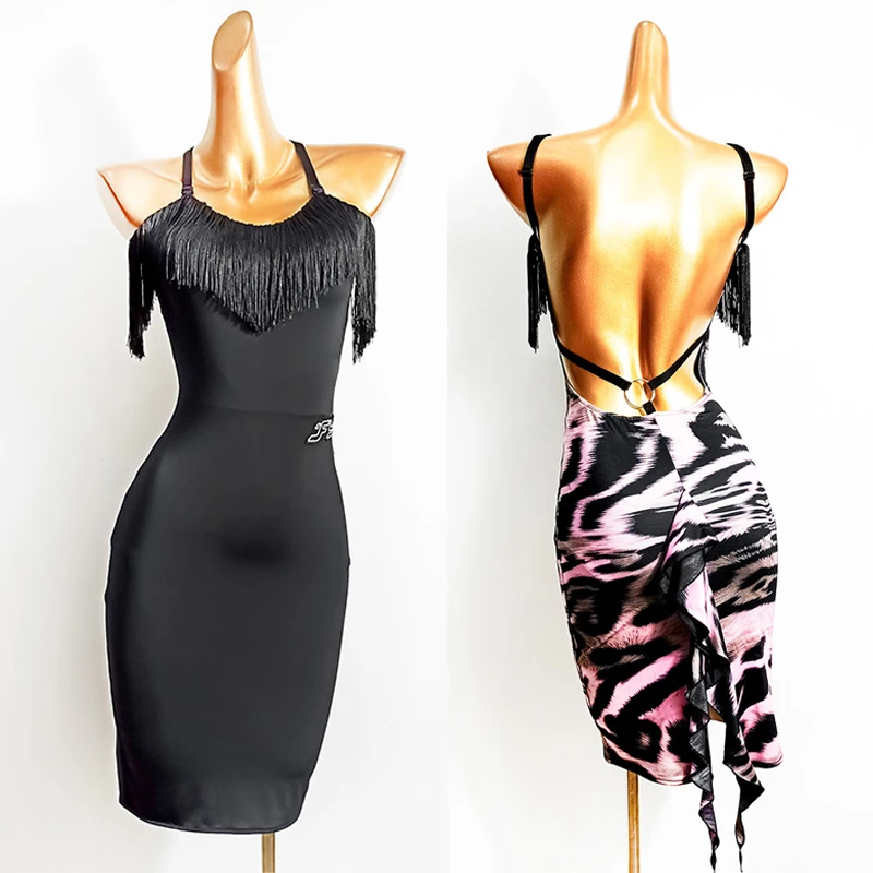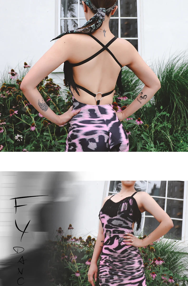Одежда для латинских танцев платье с низким вырезом на спине, с бахромой, платья для женщин в африканском стиле; Цвет черный, с леопардовым принтом, для танцев, тренировочная одежда Самба Танго выступление костюм VDB2254