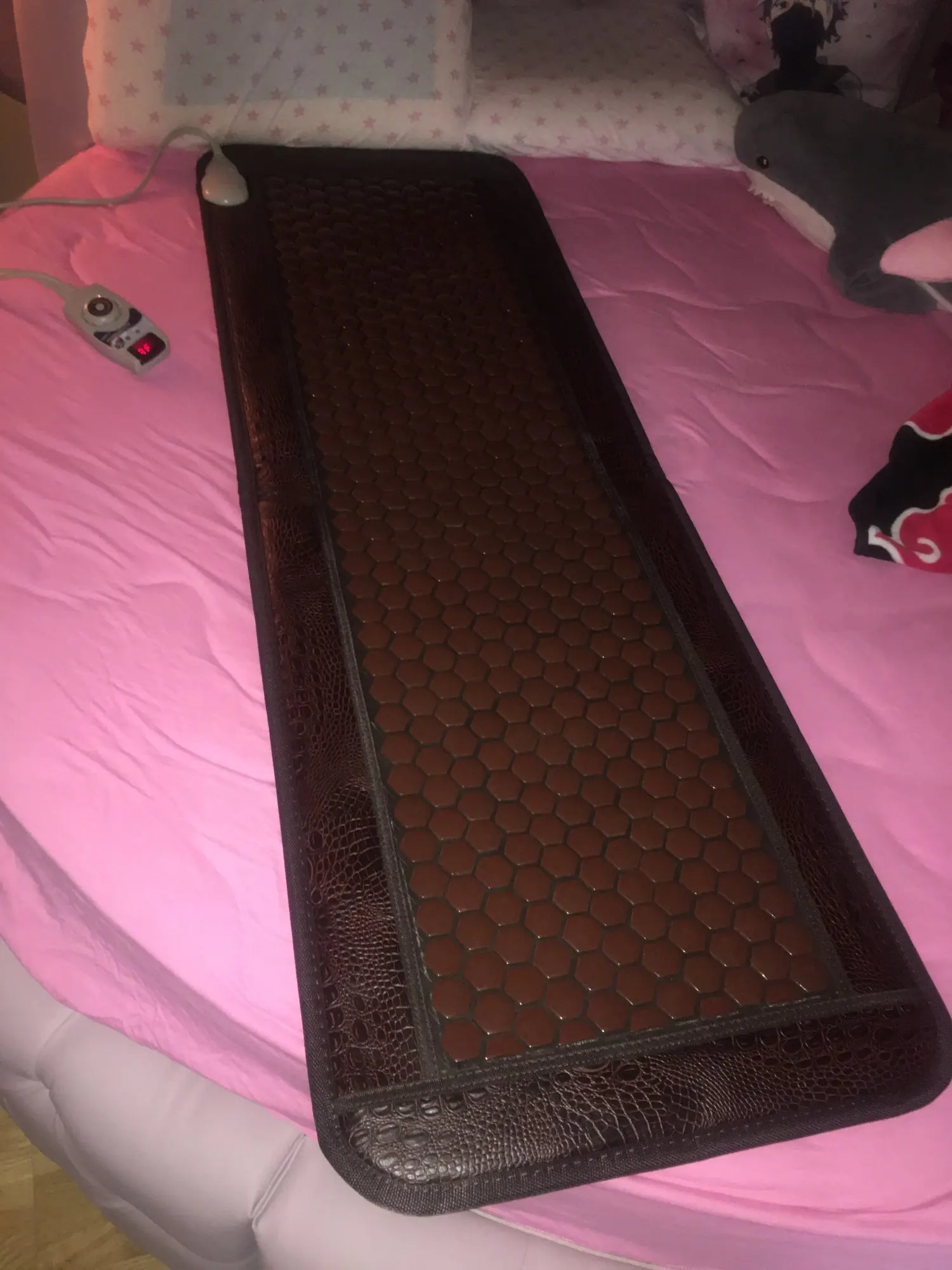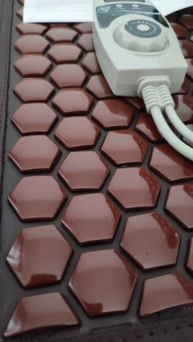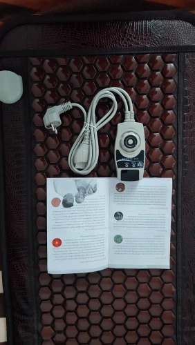 греет. температуру показывает. на счёт максимума даже не пробовали, для себя удовлетворяюсь температурами до 50°. расслабляет, усыпляет, приятная штука. как на фото. размер 150*50 оптимально для нас, стараемся не сгибать. не могу сказать на счёт камней, не знаю германий или просто, но точно не пластик.