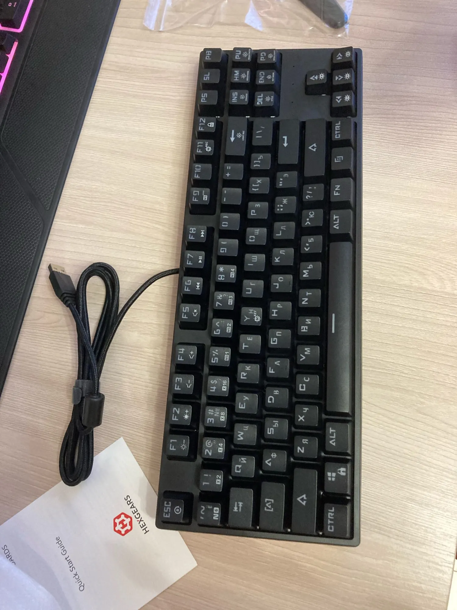 Отличная клавиатура. Пришла в оригинальной коробке, внутри которой еще картонная коробка для защиты. Клава в комплекте с снимателем для клавиш двух типов. Попросил продавца написать стоимость 20$ на посылке, выполнил просьбу, написал 19.8. Всё отлично, можете брать, клава рабочая, новая. Касательно клавиатуры, минус в достаточно тусклой подсветке. В солнечный день или при включенной лампе её вообще почти не видно. (2-е фото без лампы, 3-е с лампой, кейкап снял для наглядности). Светодиоды сверху кейкапа и почти не подсвечивают русские буквы, что не очень хорошо. Но с другой стороны, при работе ночью, не будет слепить. Так что тут две стороны