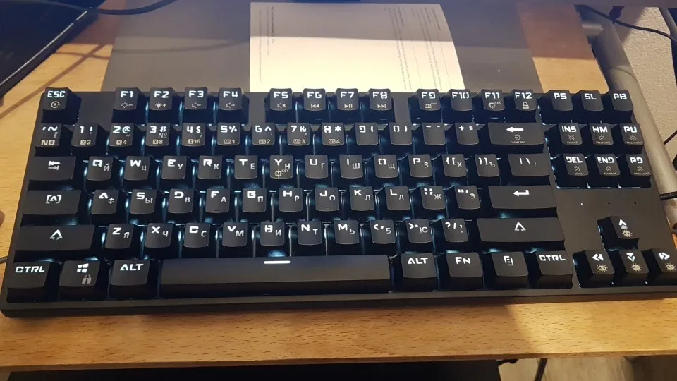 звук хороший, смазано с завода, люфт капов небольшой. Огромный минус данной клавиатуры - подсветка. Она здесь настолько ужасная, что видно полосу, по короткой эта самая подсветка проходит. То есть, покупая gk12 вы получите русские символы, которые вообще не светят.