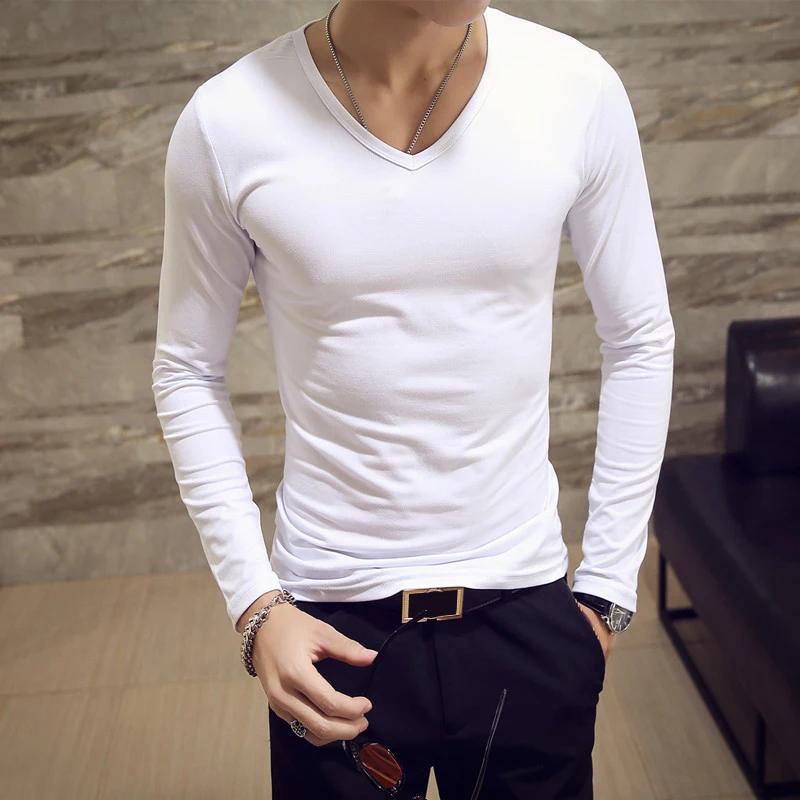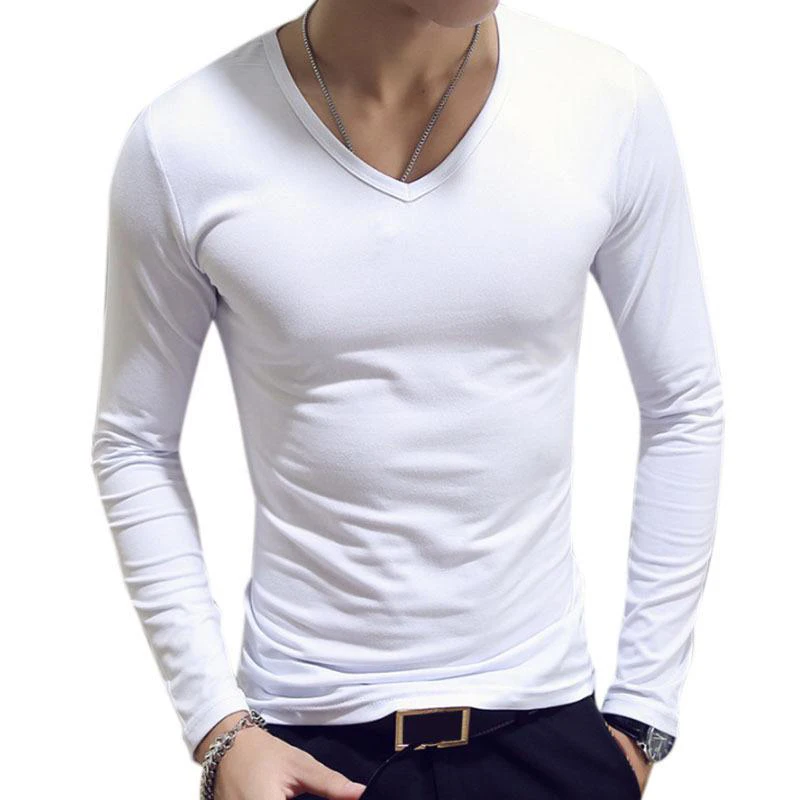 Мужская Однотонная футболка с V-образным вырезом, весна-осень