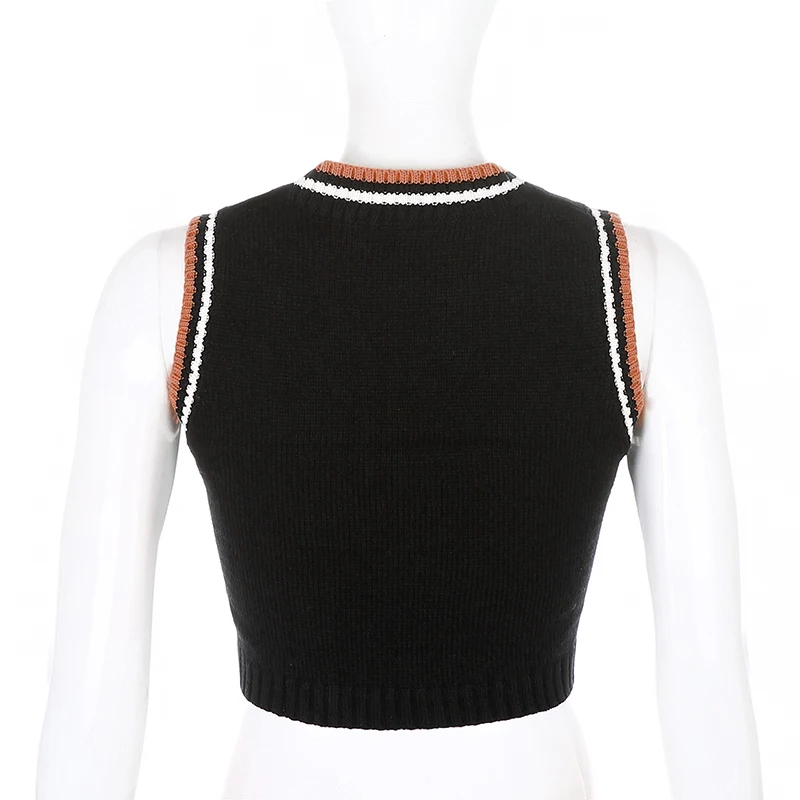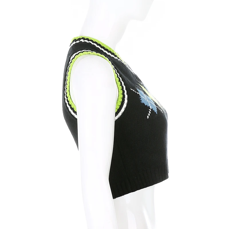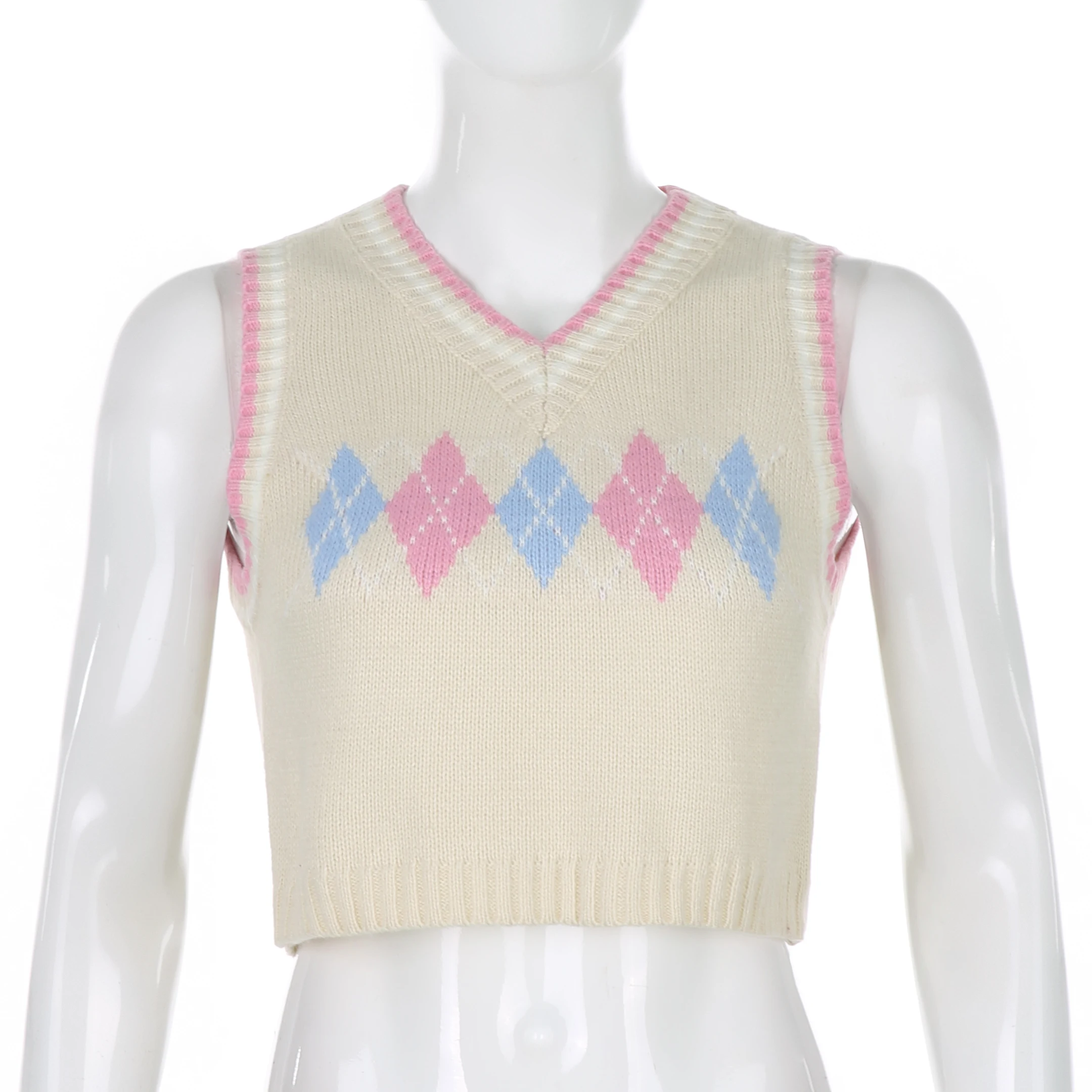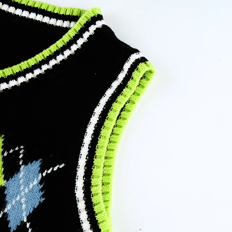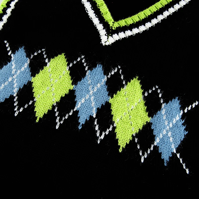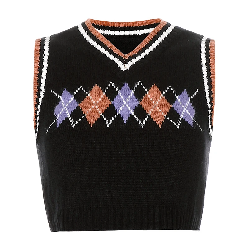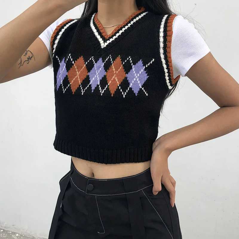 Свитер Rapcopter с узором ромбиками, Свитера без рукавов, милые топы с V-образным вырезом, укороченная трикотажная одежда, новая верхняя одежда, осенняя Женская майка, вязаный жилет