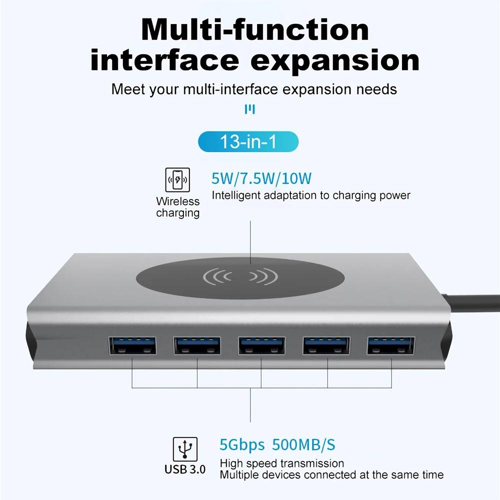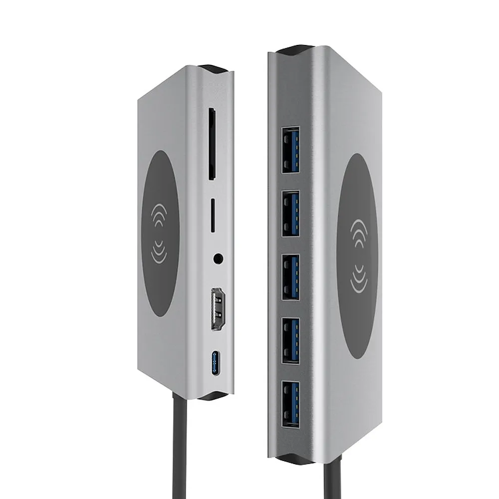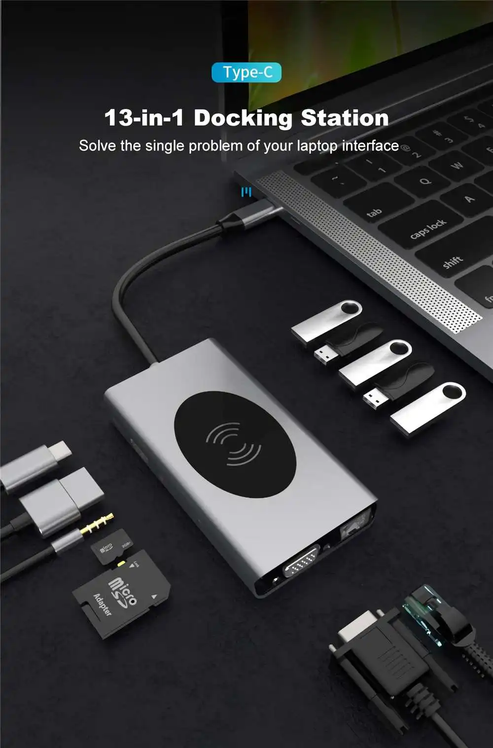 13 в 1 USB-C концентратор Беспроводной зарядный адаптер мульти Тип USB с разъемами типа C и USB3.0 VGA RJ45 HD 4K PD аудио 3,5 мм TF карты памяти SD док-станции