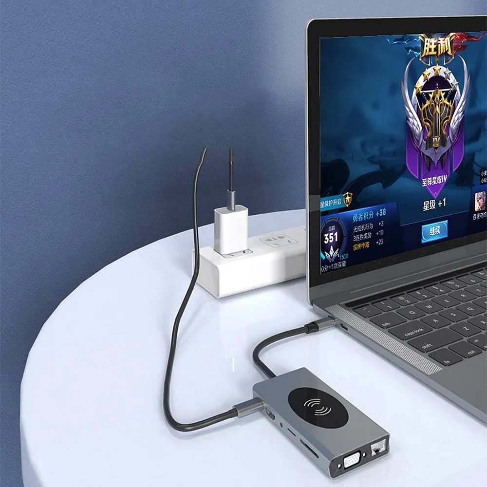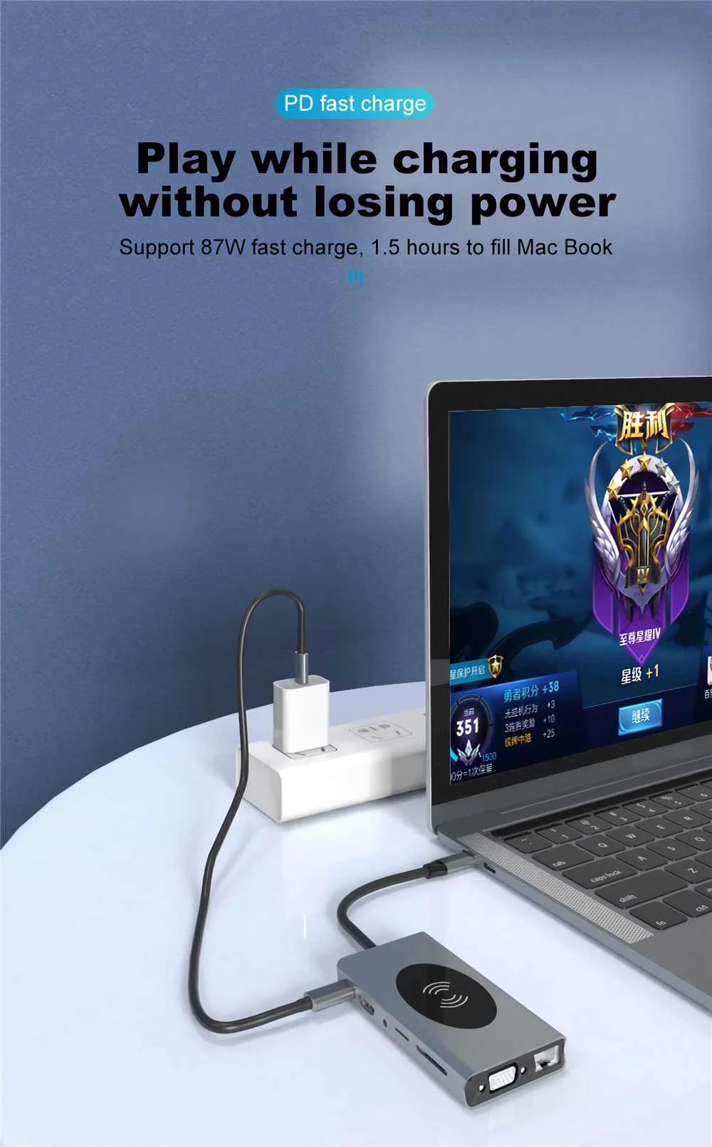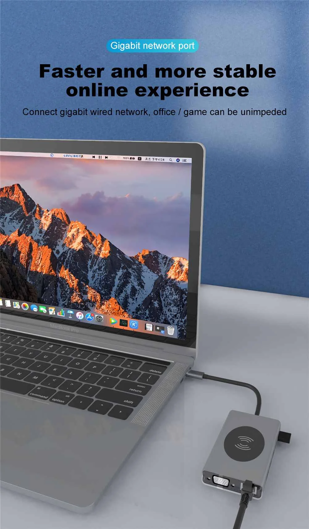 13 в 1 USB-C концентратор Беспроводной зарядный адаптер мульти Тип USB с разъемами типа C и USB3.0 VGA RJ45 HD 4K PD аудио 3,5 мм TF карты памяти SD док-станции