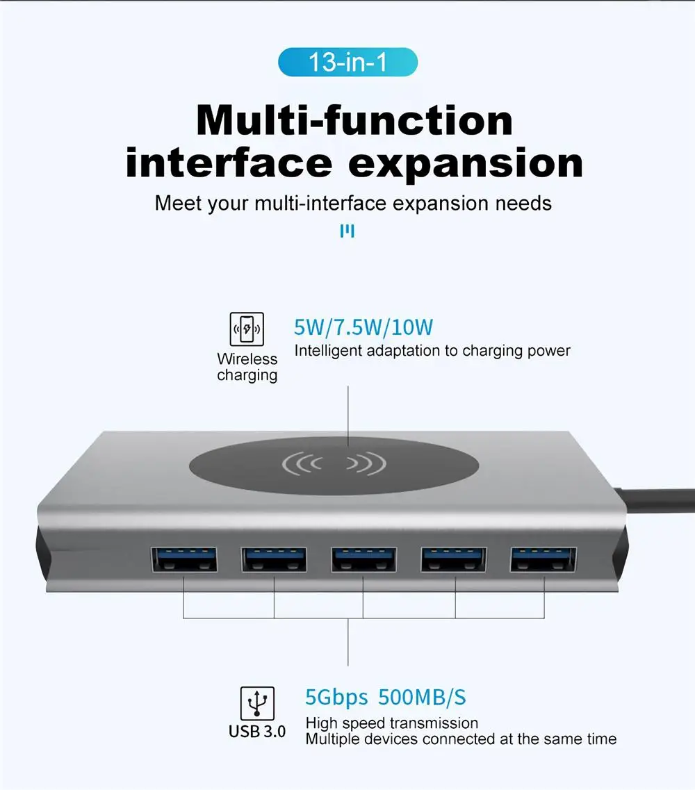 ◆ 13-в-1 док-станция, решить одну проблему вашего интерфейса ноутбука ◆ Многофункциональное расширение интерфейса, удовлетворение ваших потребностей в расширении нескольких интерфейсов ◆ Бесконечные возможности беспроводной эры, интеллектуальная адаптация для Xiaomi 5 Вт/для iPhone 7,5 Вт зарядка Быстрая зарядка PD. Играйте во время зарядки без потери мощности. Поддержка быстрой зарядки 87 Вт, 1,5 часа для полной зарядки Mac-Book ◆ Передача 5s фильма 1G. Скорость передачи 5 Гбит/с, 500 МБ/с./с в секунду, быстрая и стабильная передача ◆ 4K HD восстанавливает истинные цвета. Подключение к телевизору с большим экраном для просмотра в кинотеатре ◆ Две карты можно считывать одновременно. Решить проблему чтения карт Mac-Book / Ultrabook без слота ◆ Gigablt сетевой порт, более быстрый и стабильный онлайн-опыт. Подключение гигабитной проводной сети, офис/игра может быть беспрепятственно