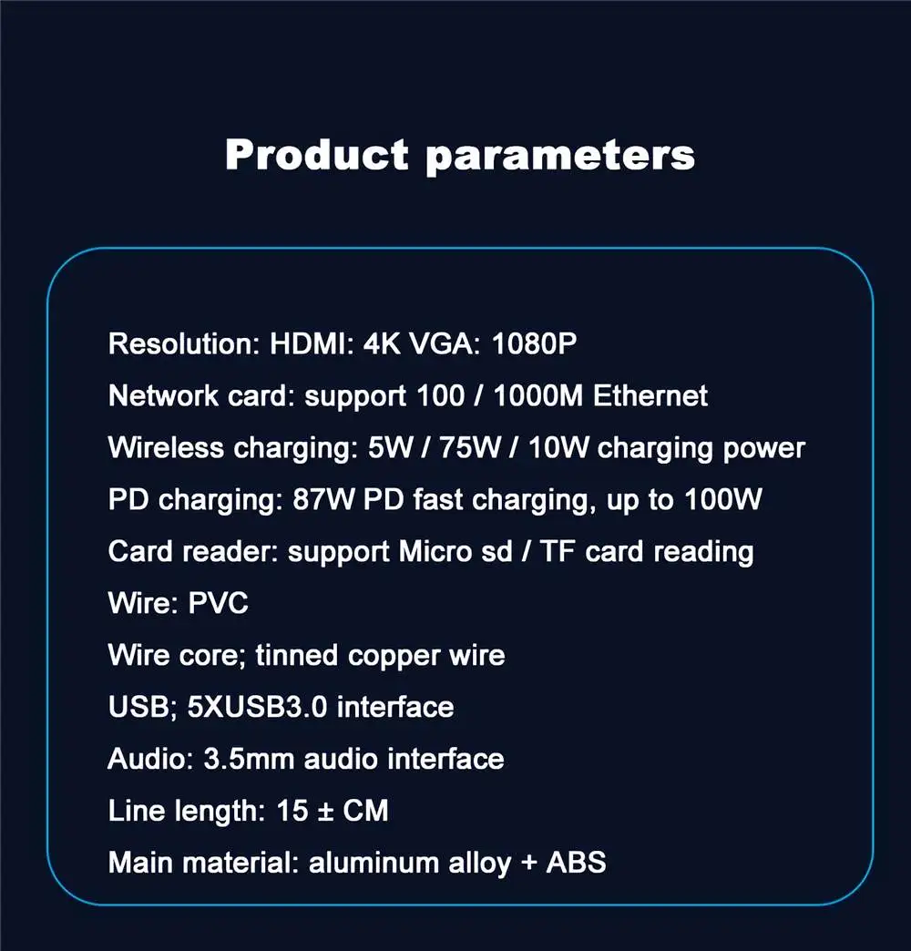Модель: TC13W Материал: алюминиевый сплав и АБС Провод: ПВХ Сердечник провода: луженая медная проволока Интерфейс: USB3.0 * 5/VGA/RJ45/HDMI/PD/Audio3.5/карта памяти/TF/10 Вт Беспроводная зарядка Разрешение: HD 4K VGA: 1080P (поддержка одновременного отображения HDMI + VGA, разрешение 1080P) Скорость передачи данных USB3.0: 5 Гбит/с Сетевая карта: Поддержка 100/1000M Ethernet Беспроводная зарядка: 5 Вт/7,5 Вт/10 Вт зарядка Аудио: 3,5 мм аудио порт PD Зарядка: 87 Вт PD быстрая зарядка, до 100 Вт Кард-ридер: Поддержка tf-карты, поддержка одновременного чтения Длина линии: 15 см Размер изделия: 120x63x1 9 мм/4.72x2.48x0.75 дюймов Вес изделия: 141 г Размер упаковки: 176x96x2 6 мм/6.93x3.78x1.02inch