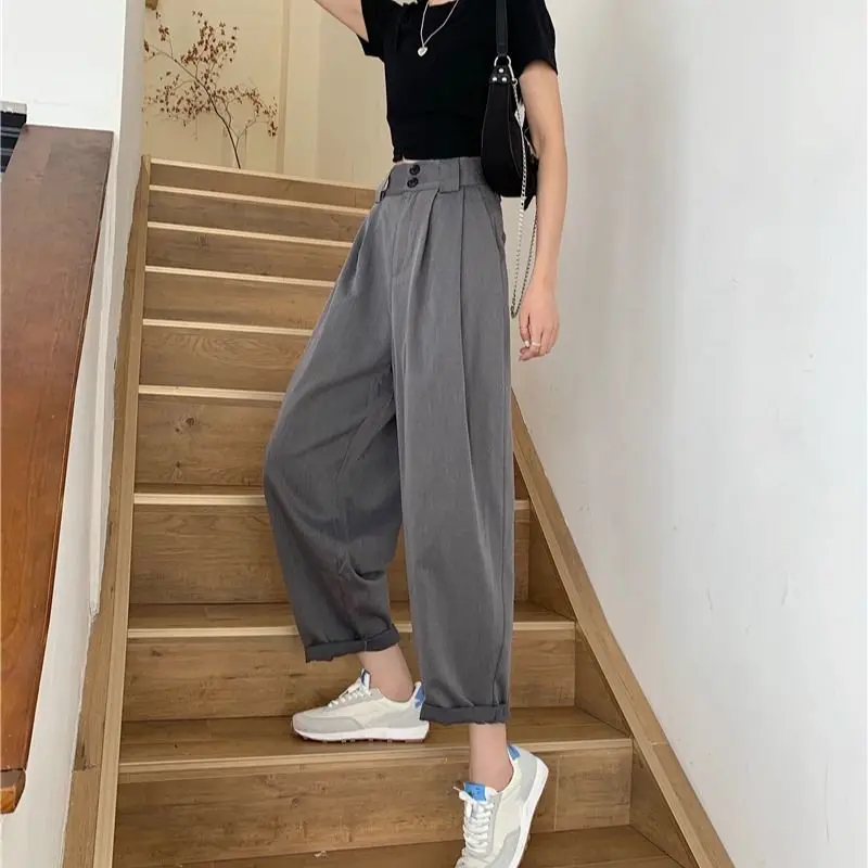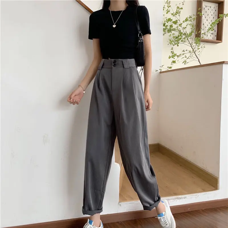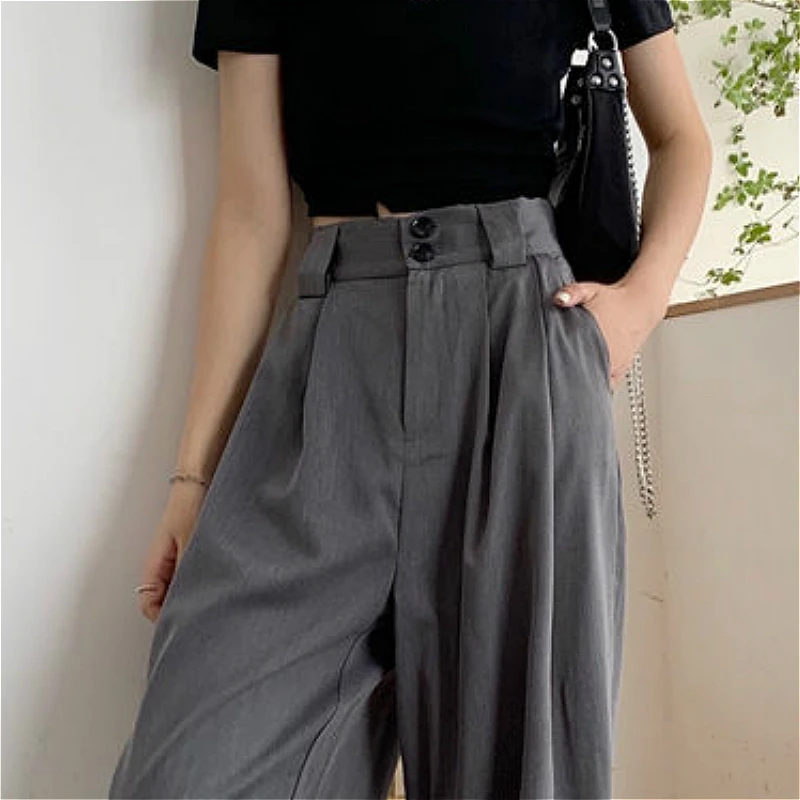 Повседневные женские брюки с высокой талией и широкими штанинами свободного кроя в Корейском стиле шикарные Универсальные однотонные офисные женские элегантные модные Ulzzang Новинка BF