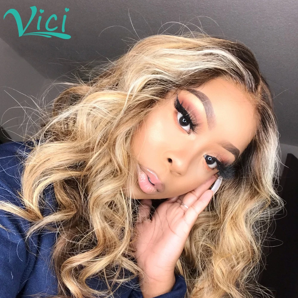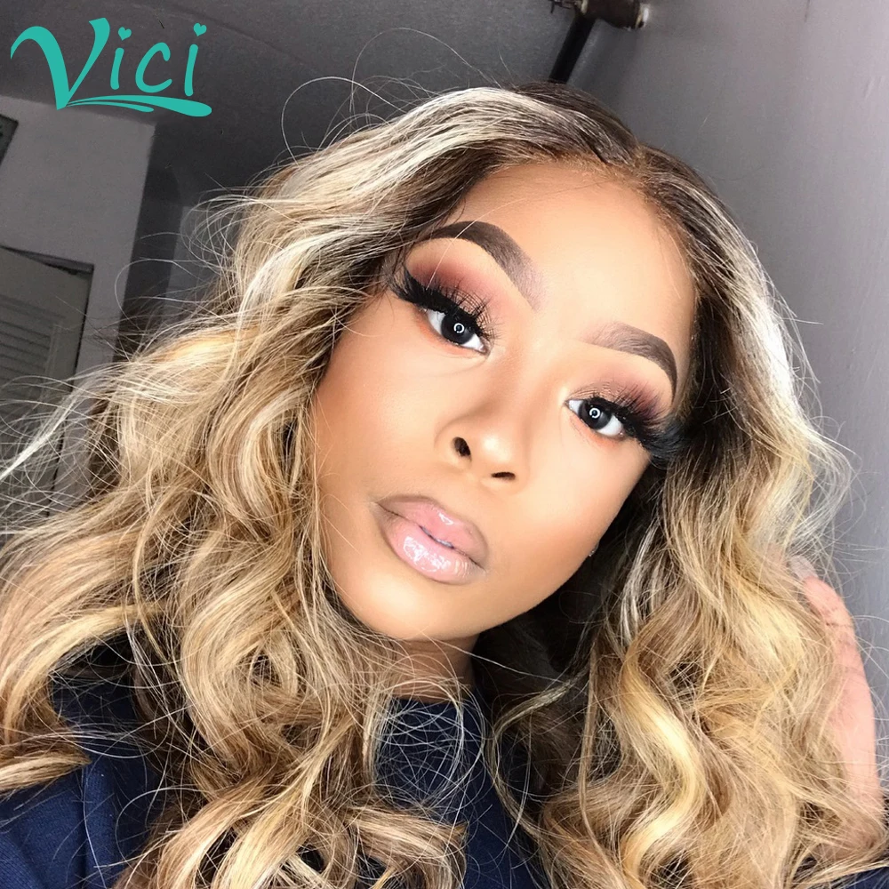 Эффектом деграде (переход от темного к объемная волна Синтетические волосы на кружеве человеческие волосы парики для женщин отбеленные узлы 13x4 кружева парик 1B27 Hightlight человеческие волосы бразильских неповреждённых волос