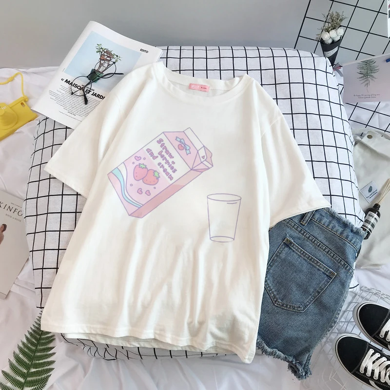 Номер моделиHarajuku Aesthetic White Tops Tshirt Japan Strawberry Juice Graphic