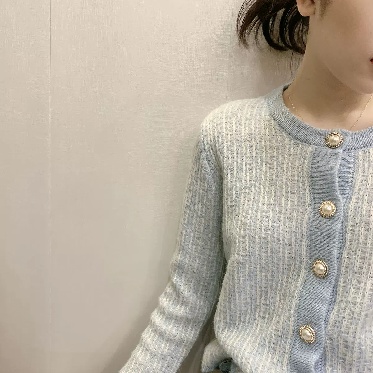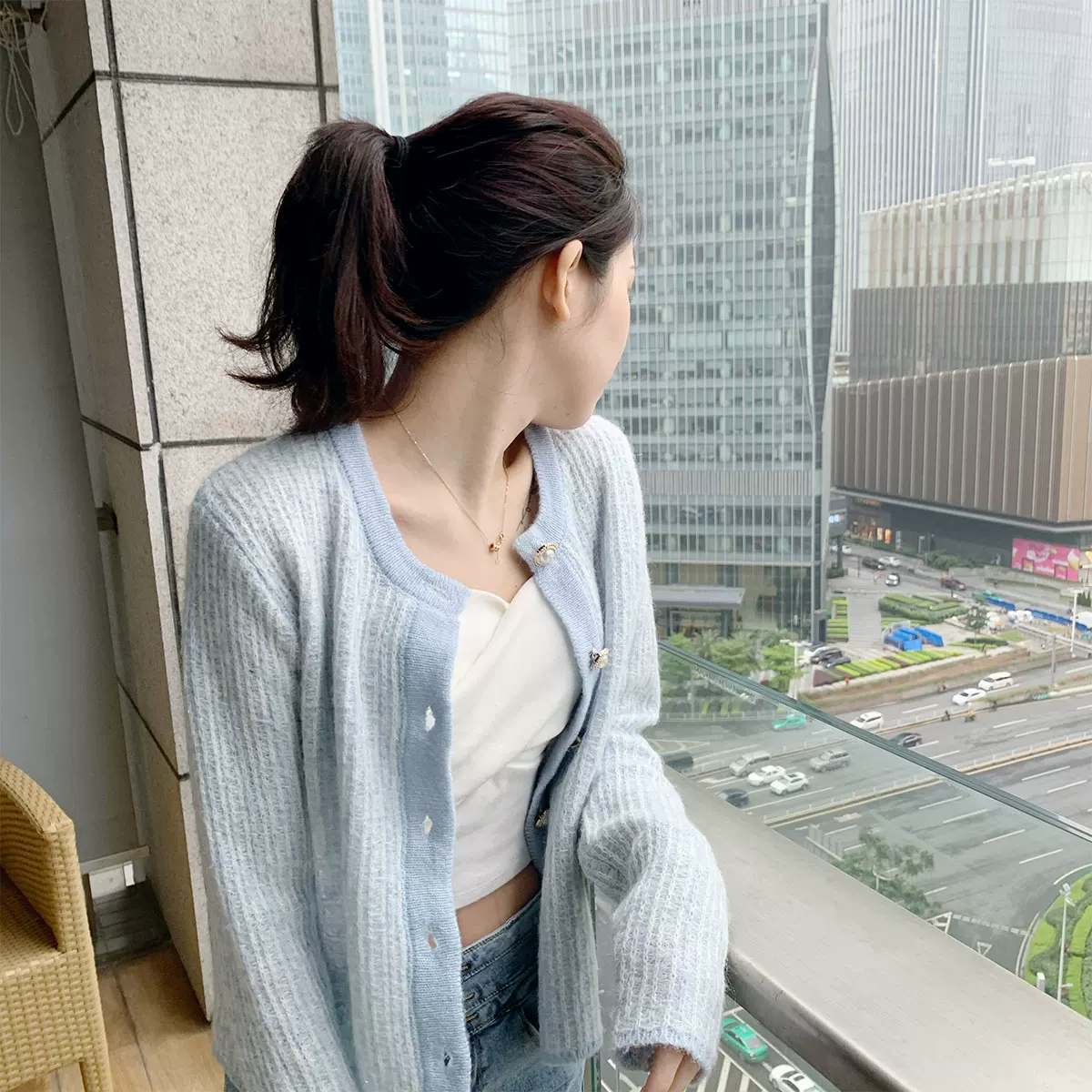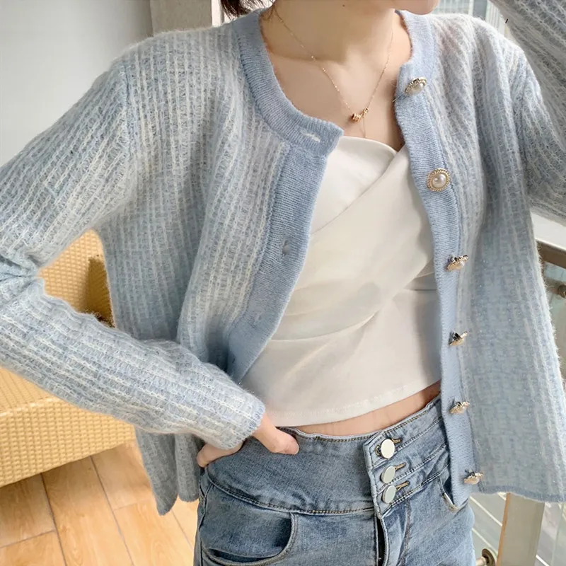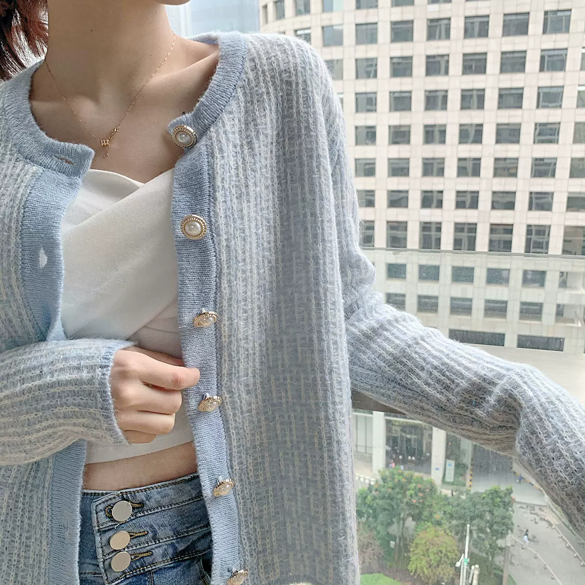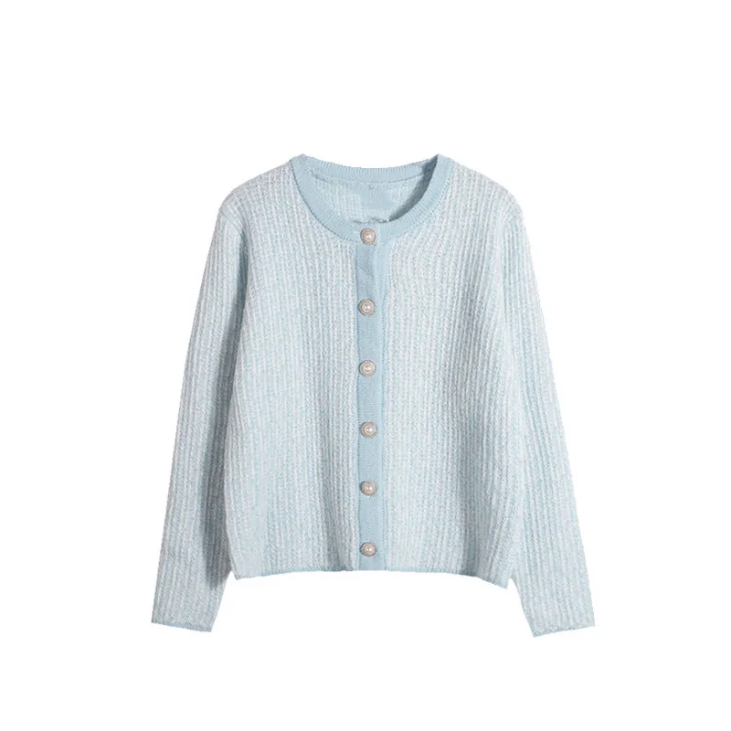 Кардиган вязаный женский, голубой, с круглым вырезом и длинными рукавами, в стиле пэчворк, осень 2020