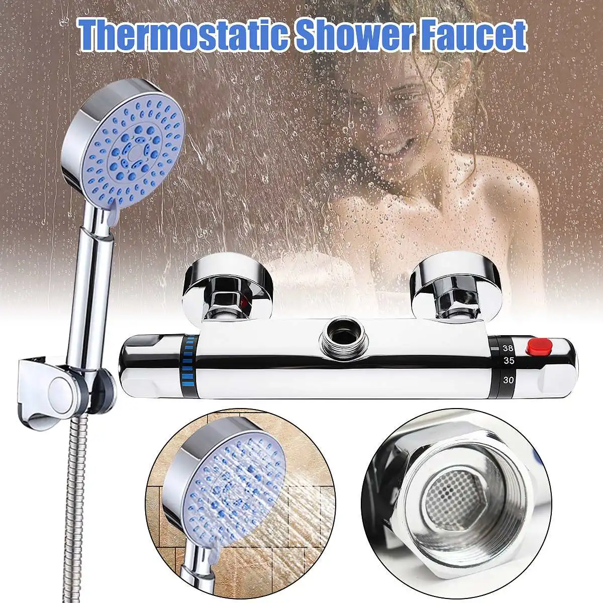 Термостатический смеситель для душа, латунный хромированный кран для ванной комнаты, двойная ручка, крепление на стену, холодная и горячая вода