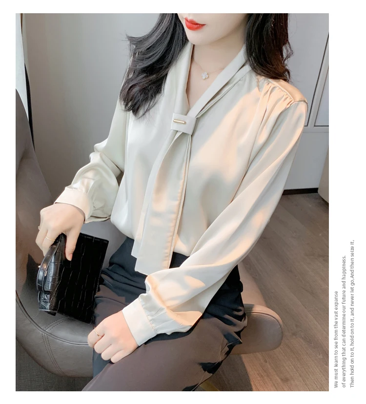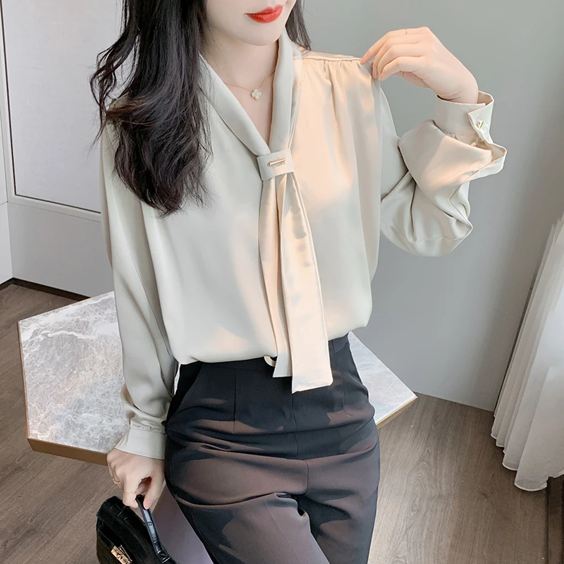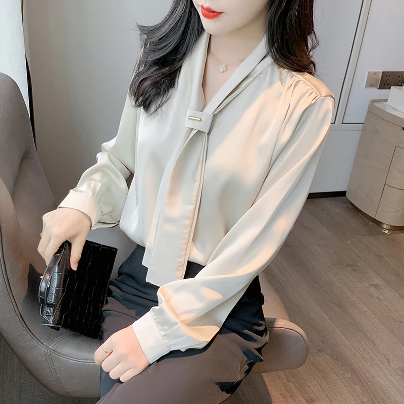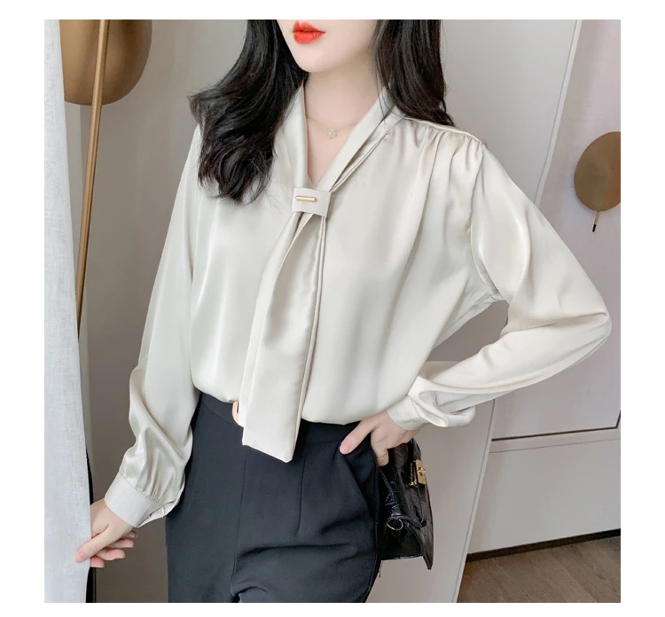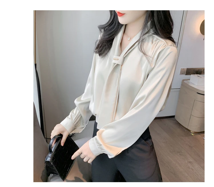 Осенняя шифоновая рубашка в офисном стиле, женская рубашка с длинным рукавом, Женская атласная рубашка, свободные женские топы и блузки с V-образным вырезом, одежда 10842