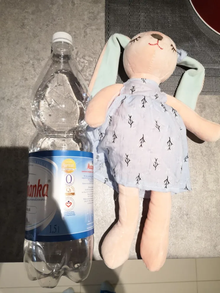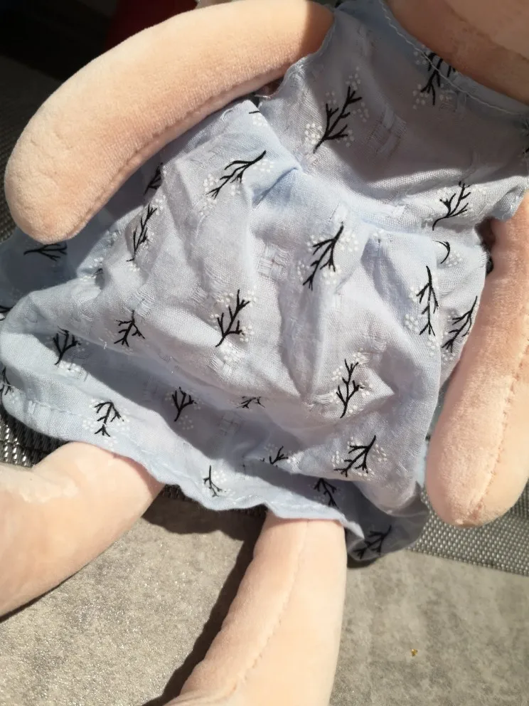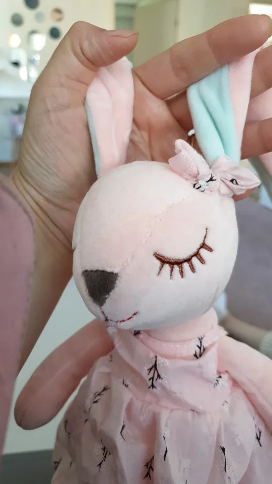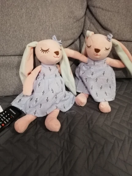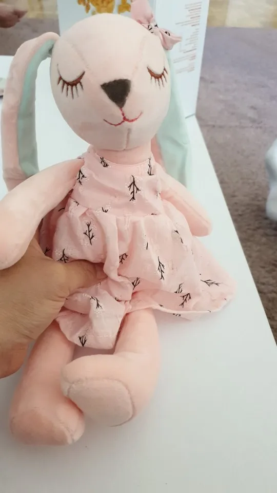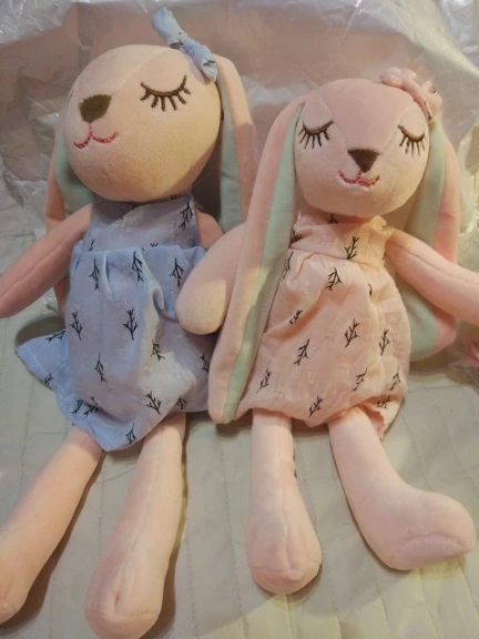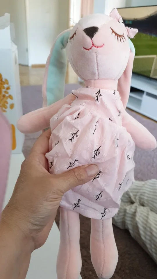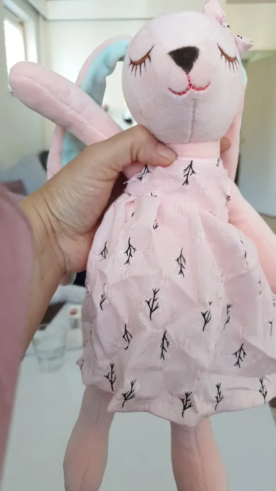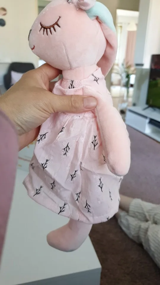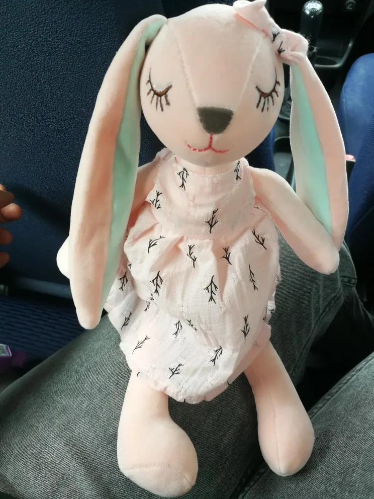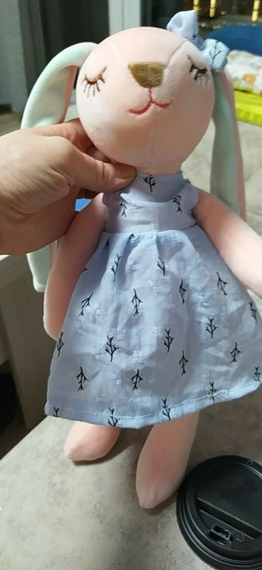 немного неаккуратно сшито платье,торчать нитки. ожидала,что сам заяц будет немного больше. но в целом милый зайка