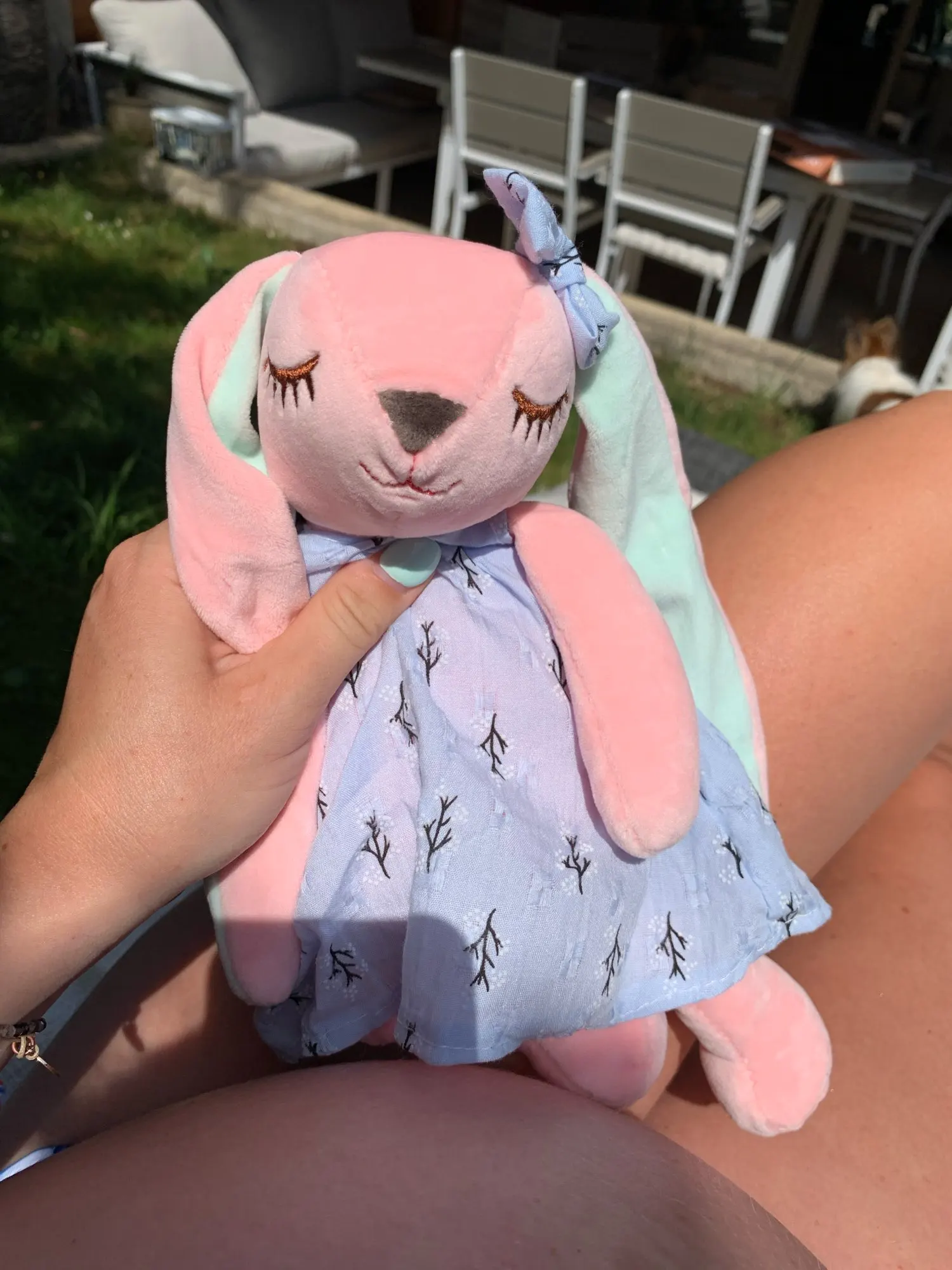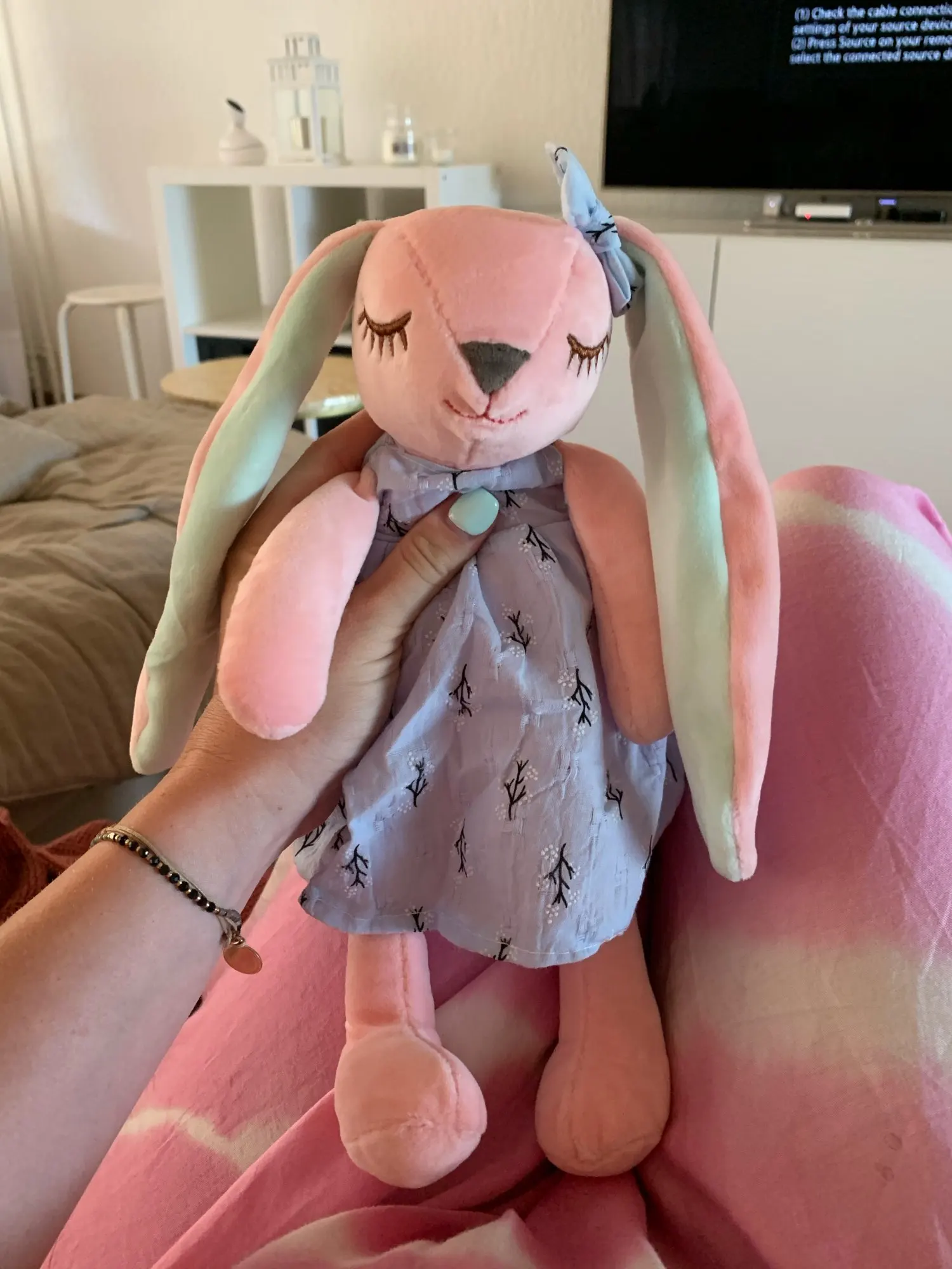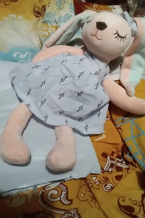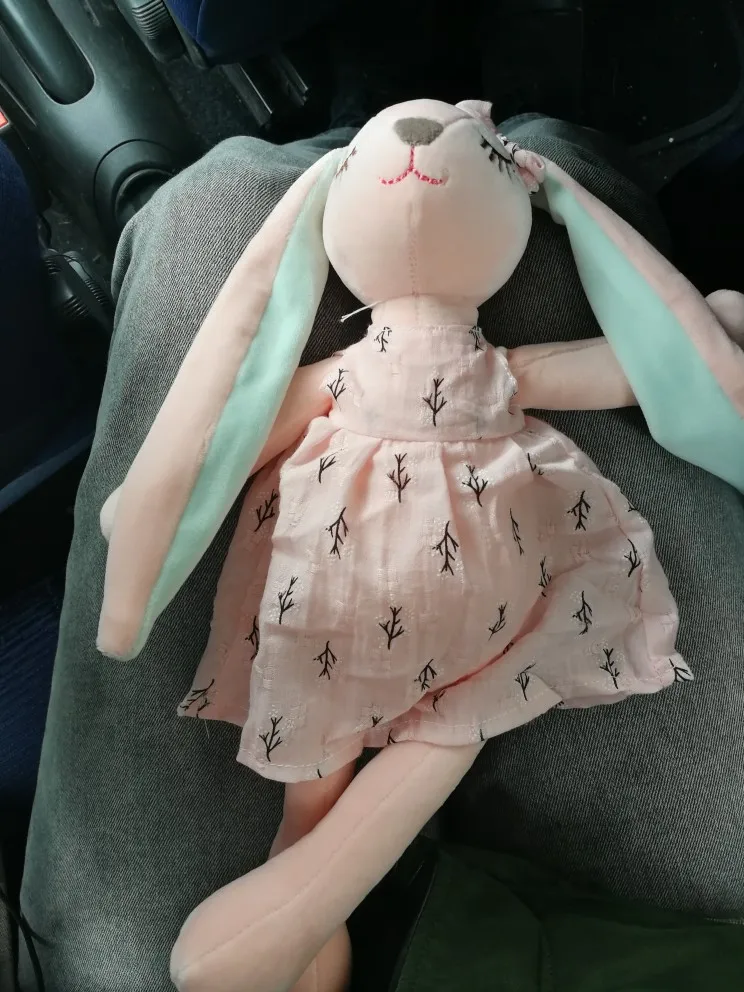 Зайчик как на фото, красивое платьишко, длинные ушки, аккуратно сшит, запаха нет.