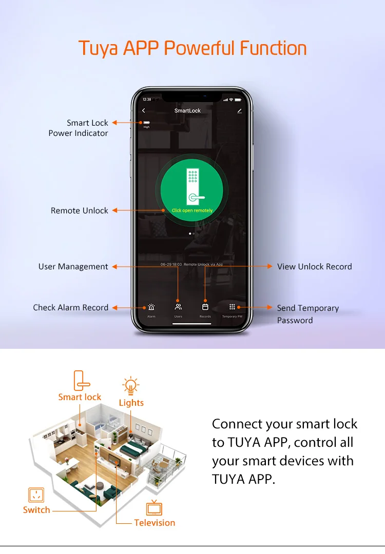 Поддерживается приложением Tuya lockПриложение Tuay lock-это приложение smart lock, его множество функций всегда удовлетворяют ваши требования●Нет необходимости в шлюзе для подключения WIFI●Отправить временный код●Просмотр журналов доступа●Откройте блокировку через приложение удаленно