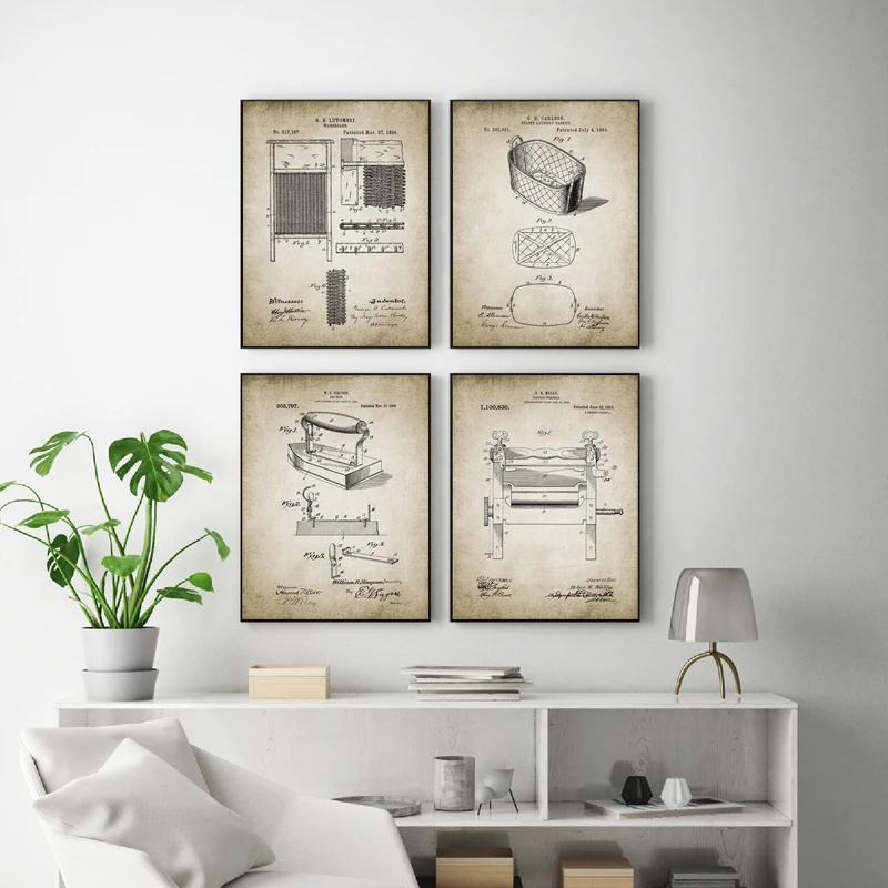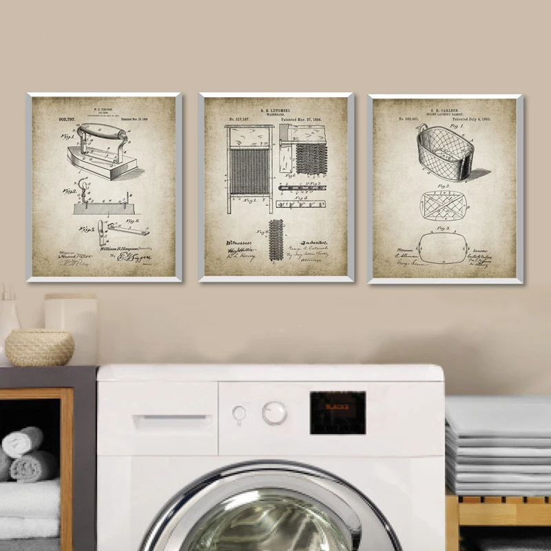 Лакированные настенные картины для стирки, винтажная мочалка, корзина для белья, железная одежда, Wringer арт-принт на холсте, плакат, декор для прачечной