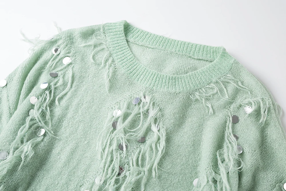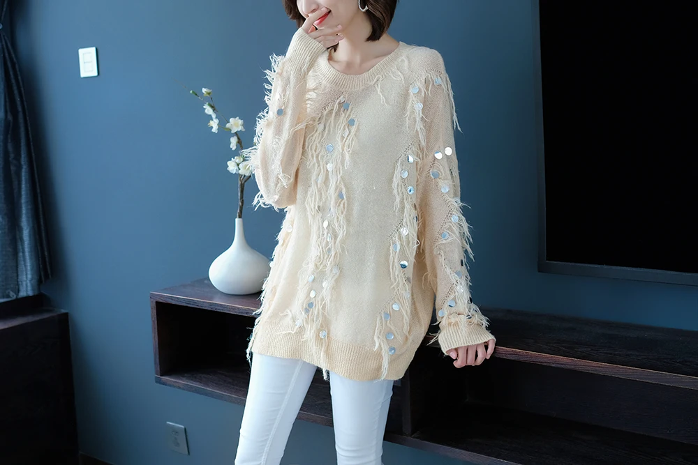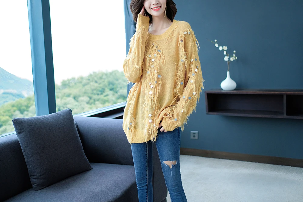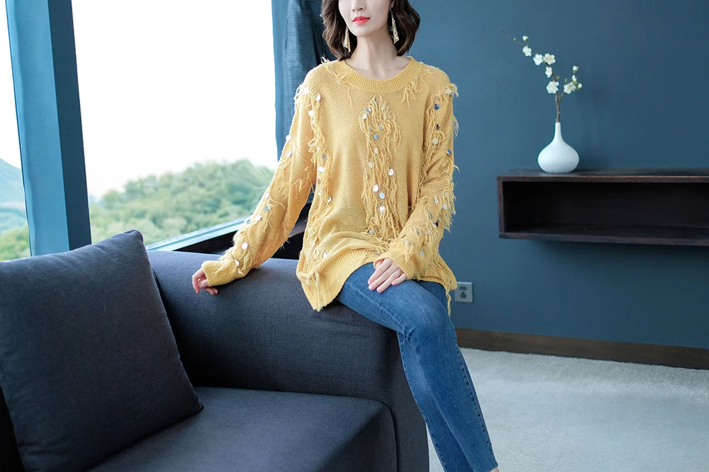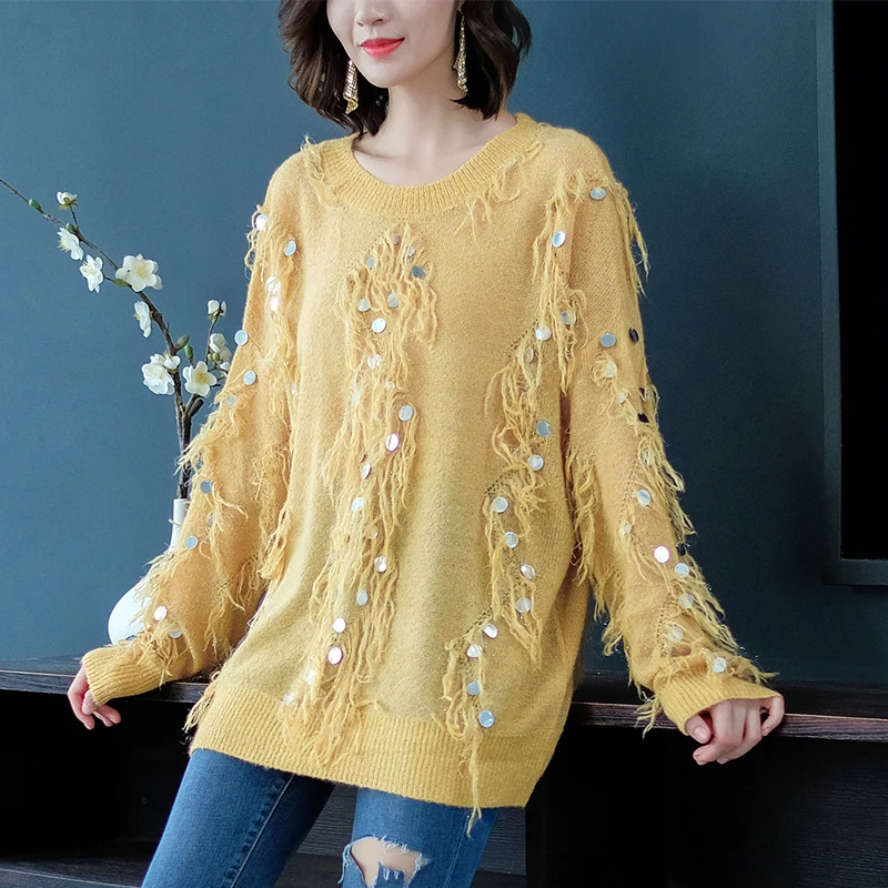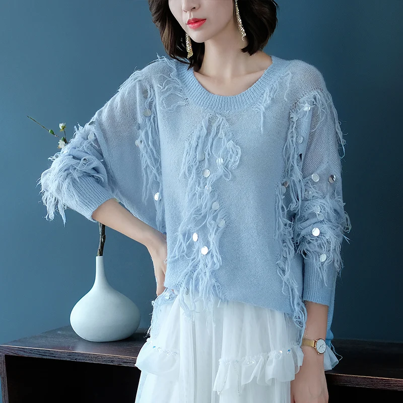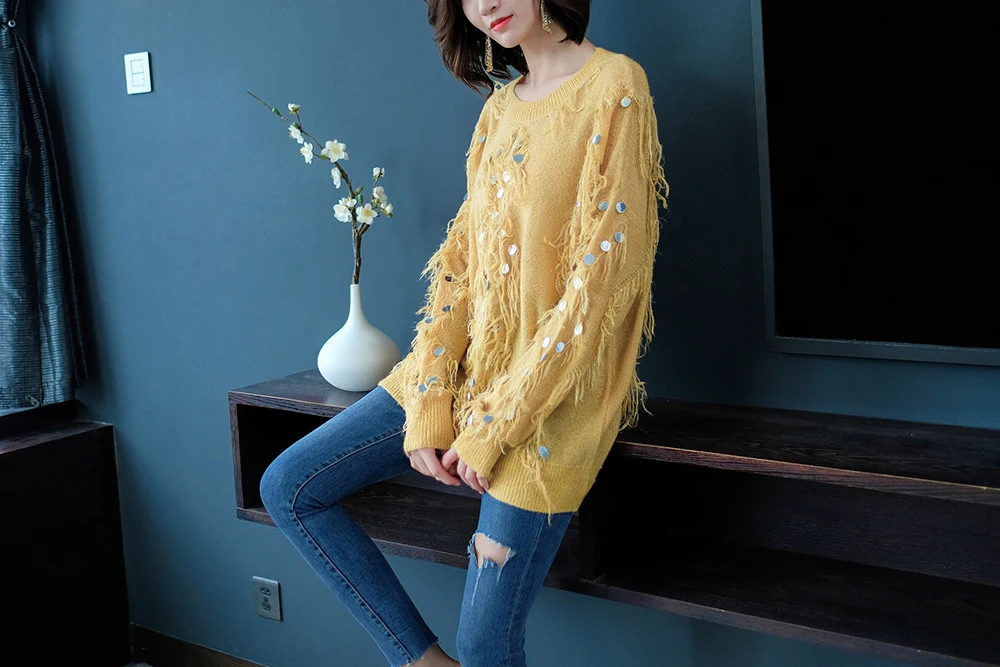 Женский мохеровый свитер YISU, Свободный вязаный пуловер с кисточками и блестками, Осень-зима