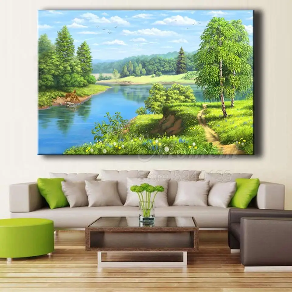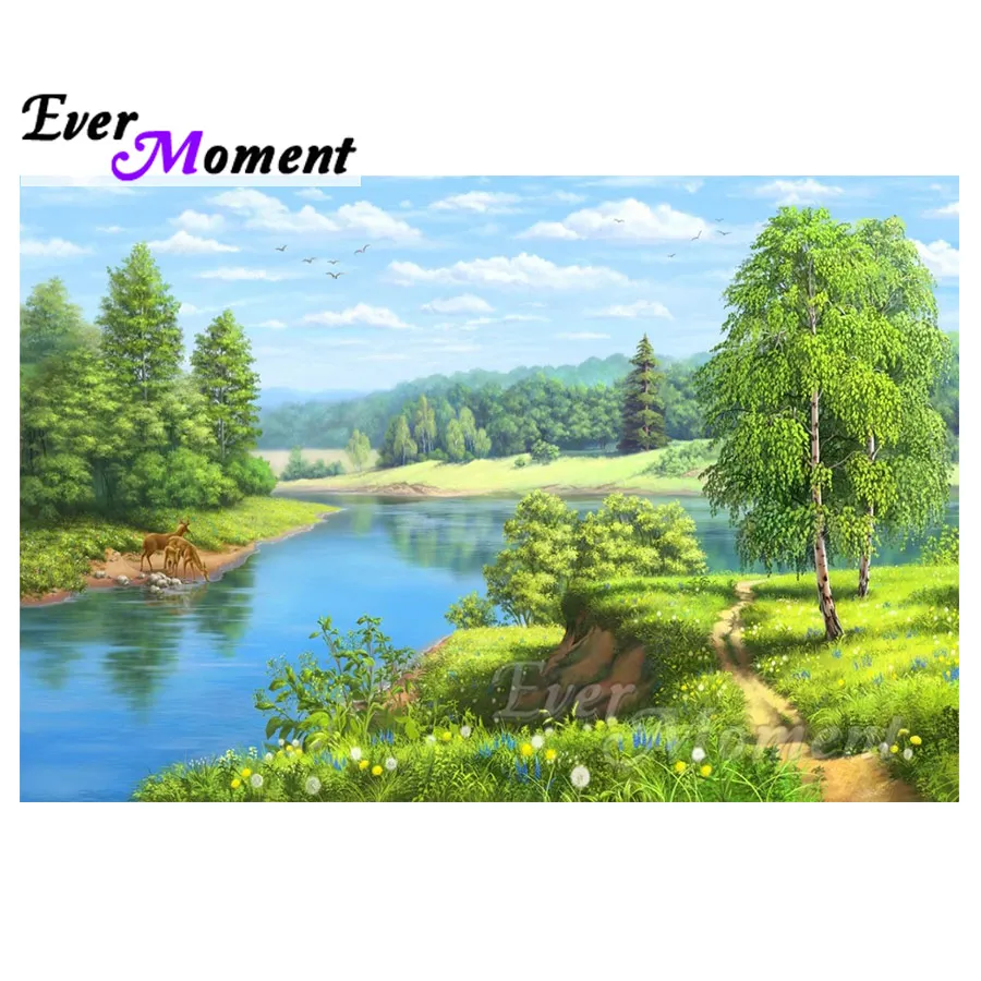 Алмазная мозаика с зеленым пейзажем, река и деревья