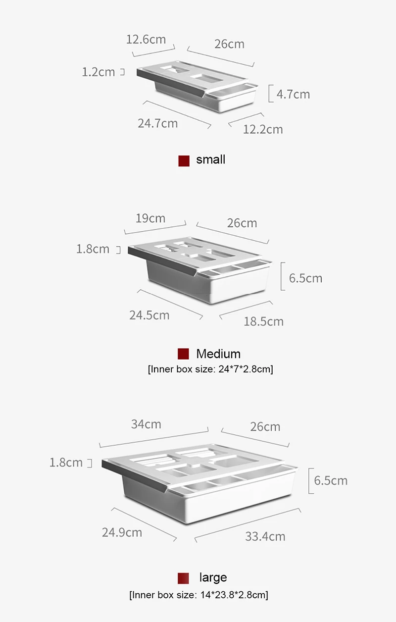 Средний: 26*19*6,5 см (включая внутреннюю коробку 24*7*2,8 см)