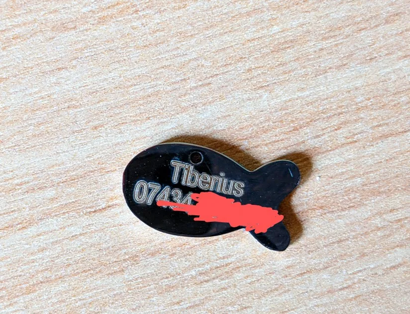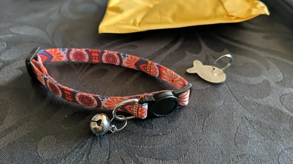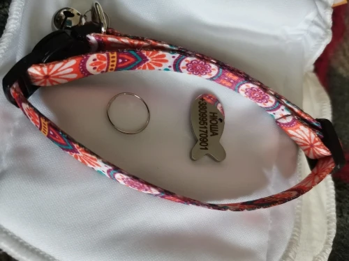 Ожерелье очень красивое и поставляется с именем и телефоном, отлично напечатанным на металлической рыбе, которую он несет. Снять крышку, потому что кошка сходит с ума от звука. Прибытие заняло немного больше времени, чем я сказал, но оно того стоит. I Recommend The item and the seller.