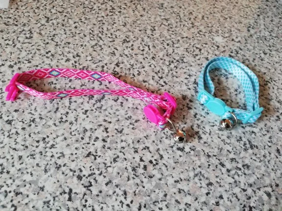 хорошие ошейники. замки открывающиеся (безопасные), если потянуть хорошенько - расстегивается, если кот повиснет на ветке, то не умрет от удушья. подпись правильная на русском, немного кривовато напечатана, но всё хорошо видно, так что не критично. качество вроде норм, ошейник не прошит, а проклеен, посмотрим, как долго прослужит