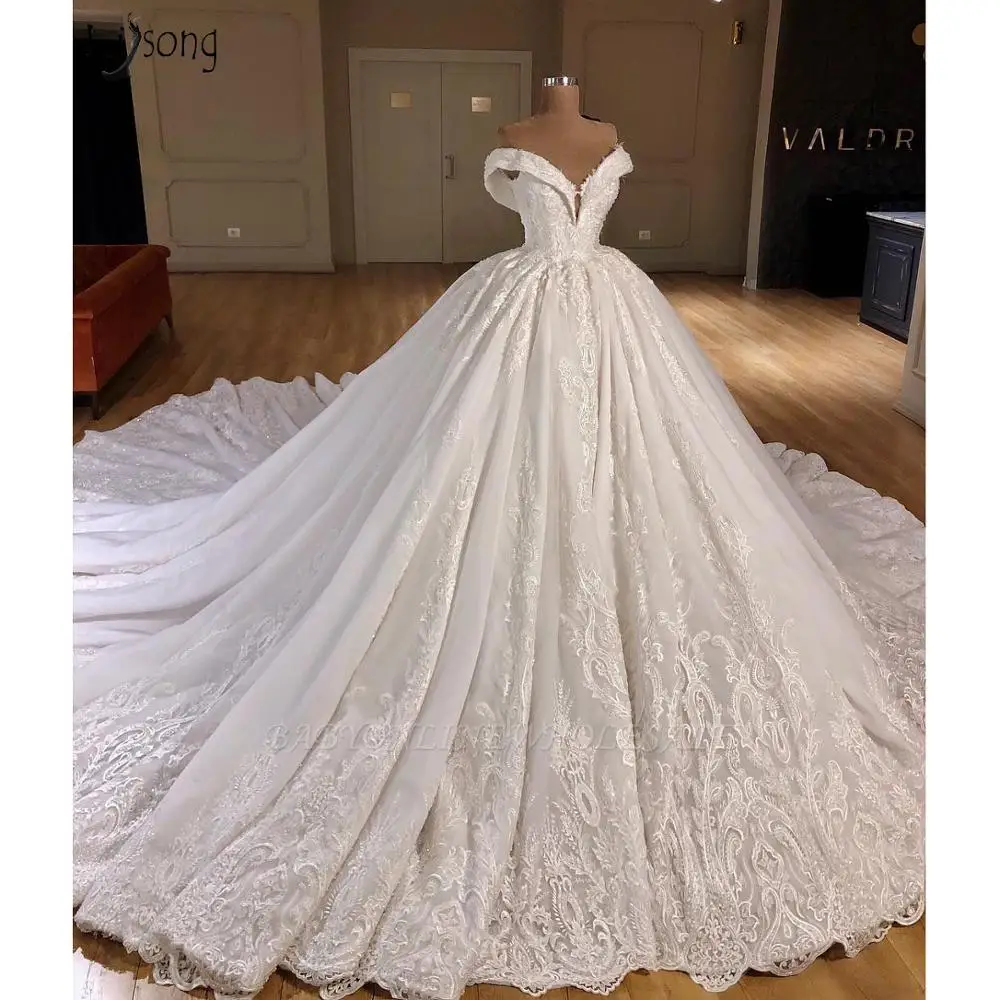 Великолепное бальное платье 2020, свадебное платье с аппликацией и открытыми плечами, свадебное платье со шлейфом для часовни, свадебные платья на шнуровке сзади