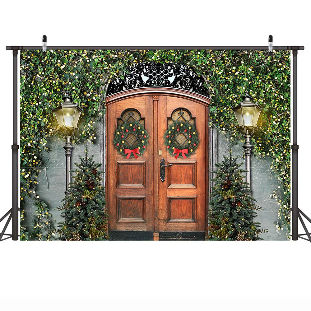 Фон для фотосъемки с рождественской тематикой, зимняя Рождественская елка, винтажный фон с деревянной дверью, светло-зеленый венок, для свадебной фотосессии