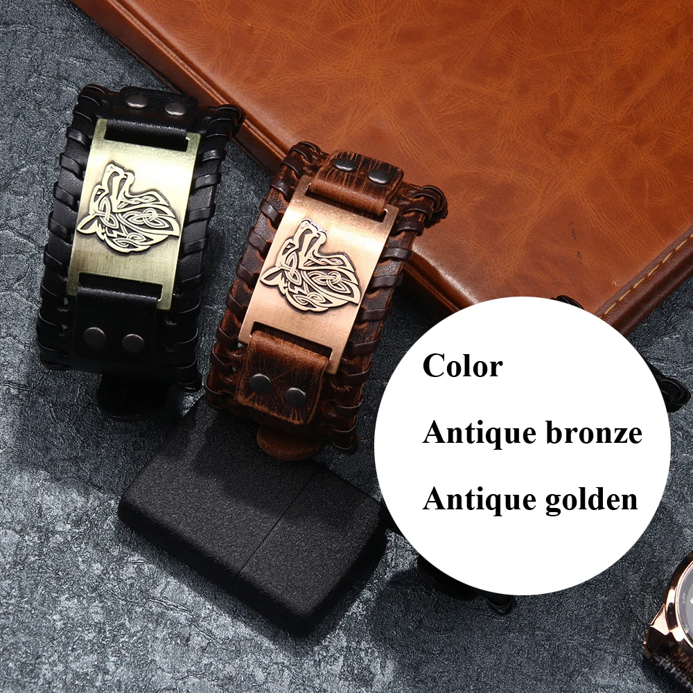 Мужские кожаные браслеты с широкой волчьей головкой, Ретро стиль, натуральная кожа, плетеные, ручная работа, черные регулируемые браслеты, Ретро стиль