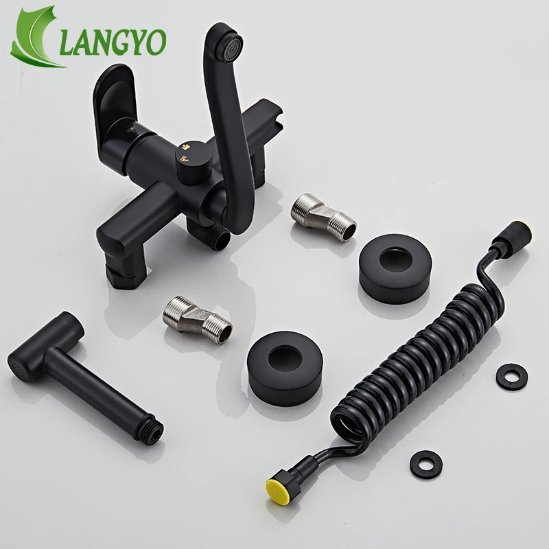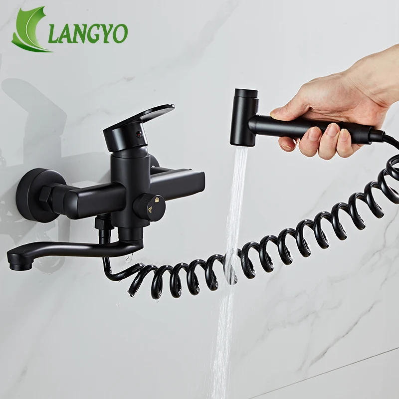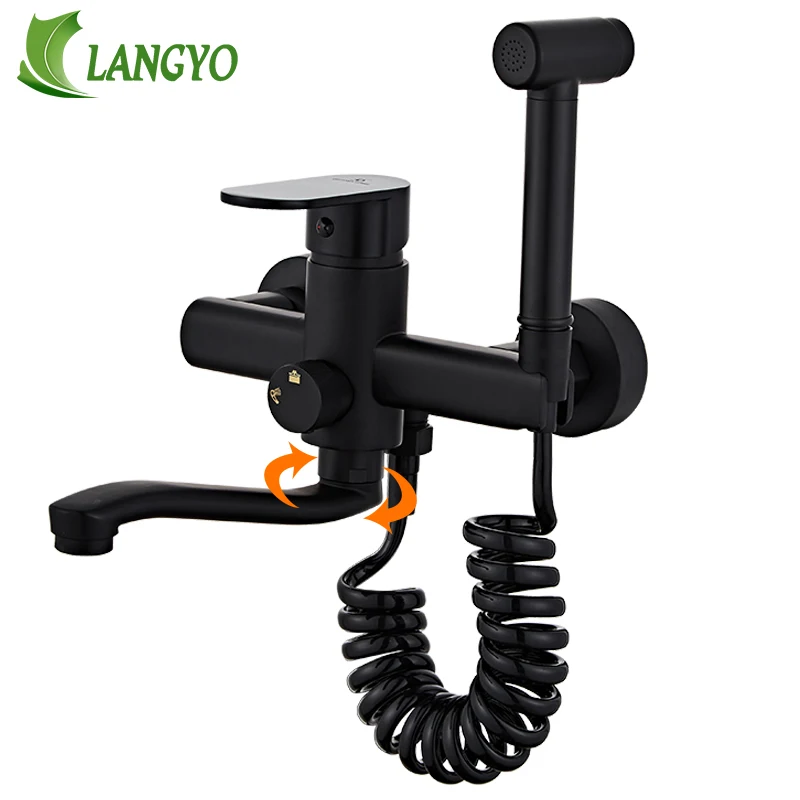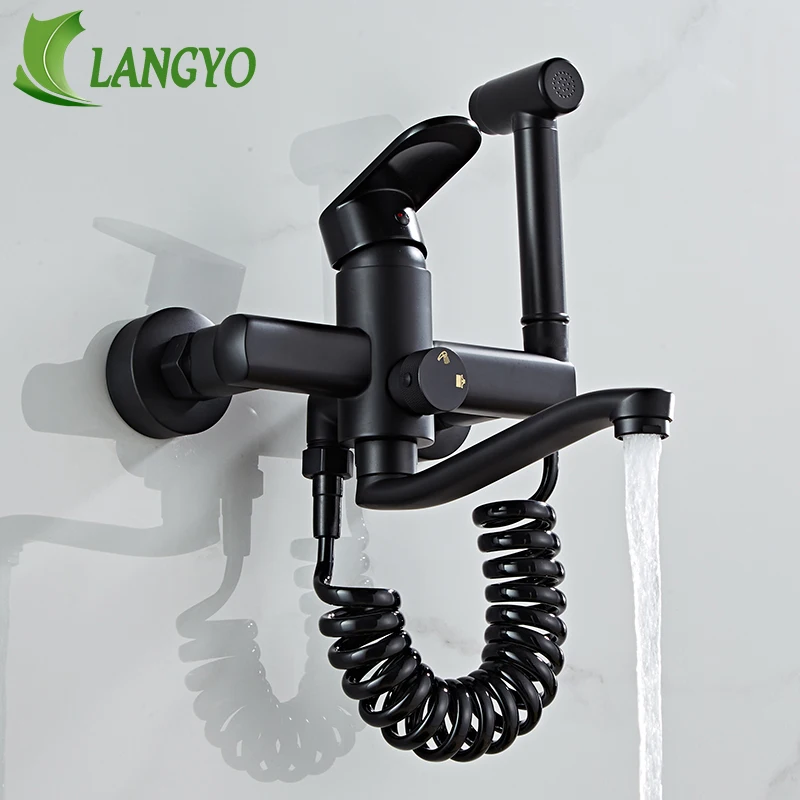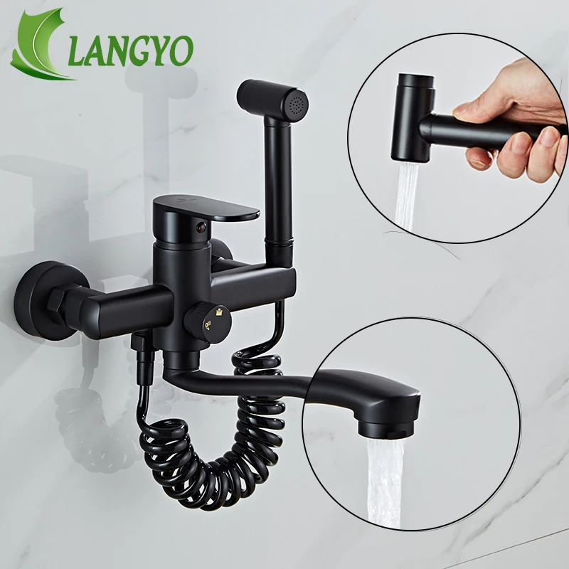 Смеситель для кухни LANGYO, черный латунный смеситель с распылителем, настенный черный вращающийся смеситель для ванной комнаты с пластиковым шлангом 1,5 м