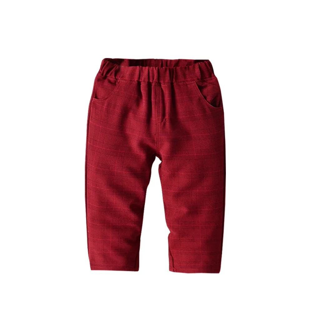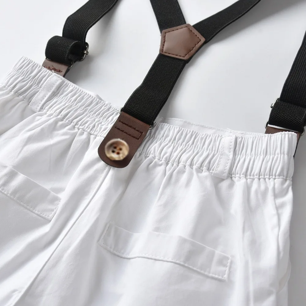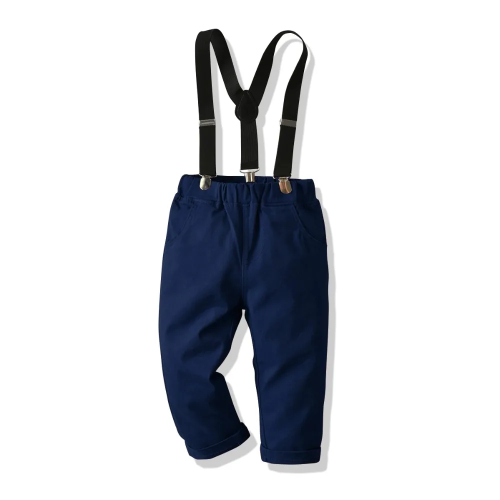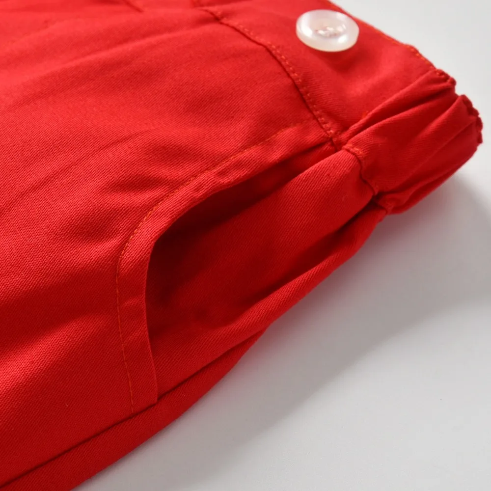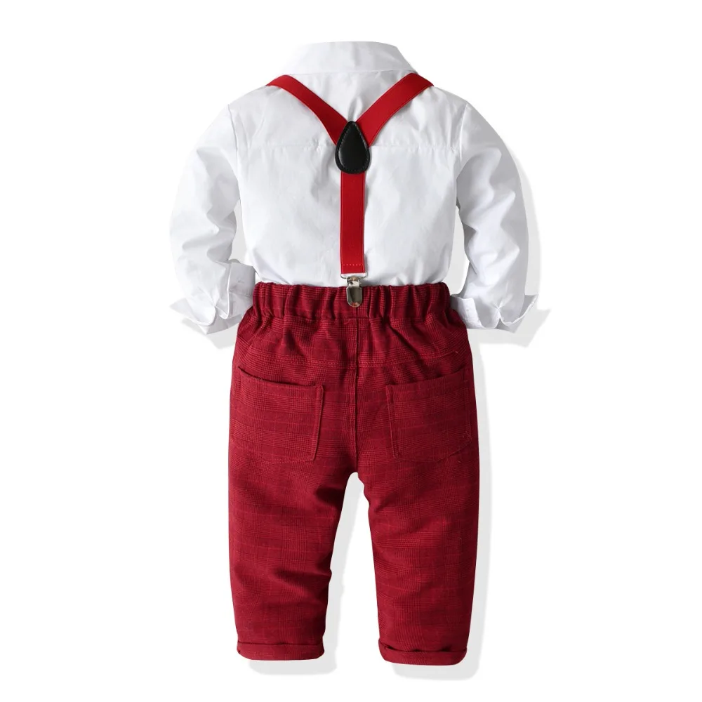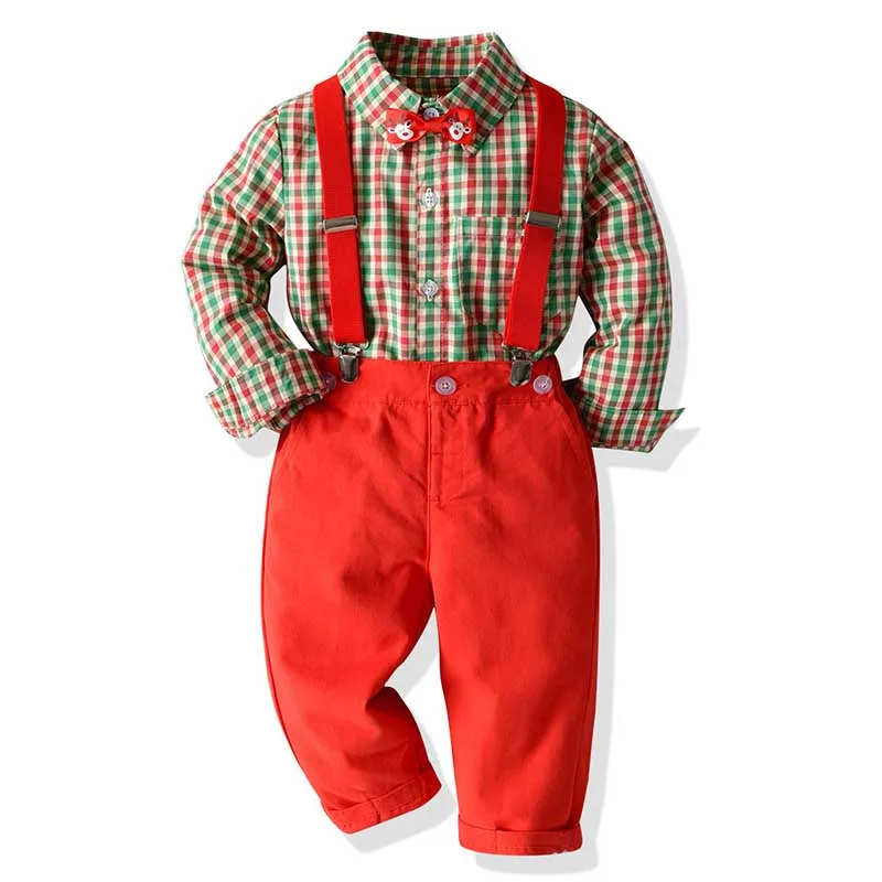 Рождественские костюмы джентльмена для маленьких мальчиков детская белая рубашка с галстуком-бабочкой + красные брюки на подтяжках, комплекты Детские вечерние костюмы