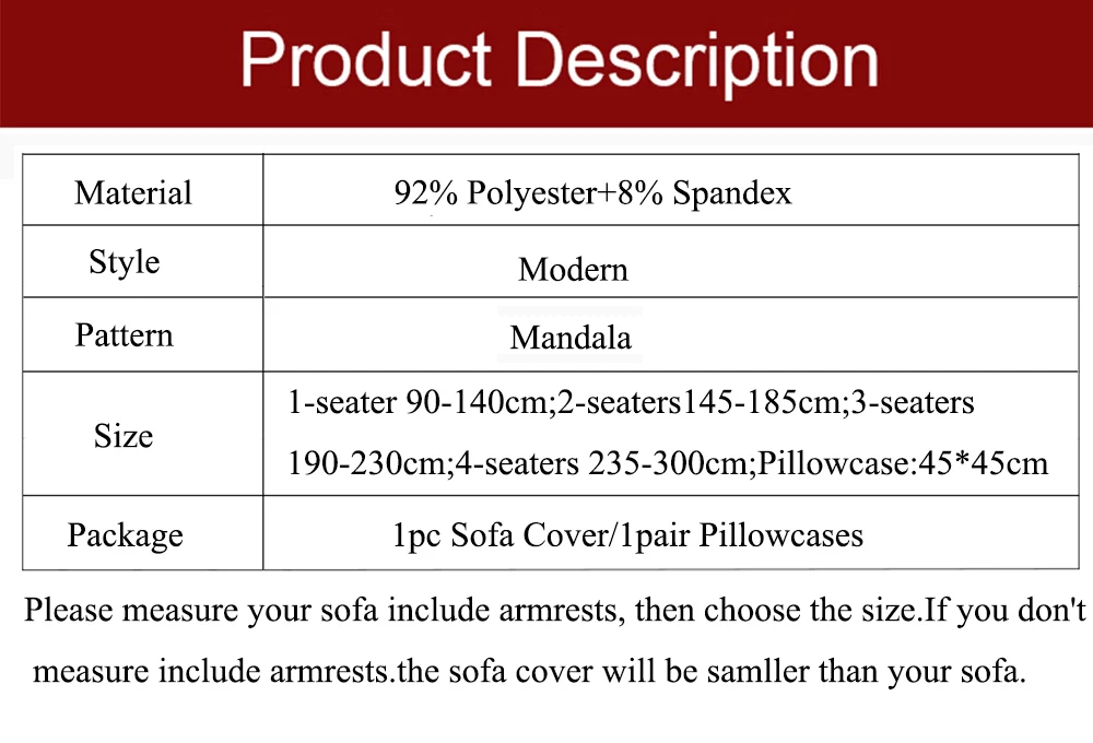 Материал: 92% полиэстер + 8% спандексУзор: МандалаСтиль: СовременныйЦвет: как на изображенииРазмер:Чехол на одно сиденье: подходит для диванов 90-140 смДвухместная крышка дивана: подходит для дивана 145-185 смЧехол для дивана с тремя сиденьями: подходит для 190-230 смЧехол для дивана на четыре сиденья: подходит для 235-300 смПрименимый диван: безрукий диван, диван с подлокотниками, l-образный диван,Mide секционный диван с подлокотниками и выберите размер. Если вы не измерите его, чехол для дивана будет меньше, чем ваш диван.Посылка включает в себя: 1 диван