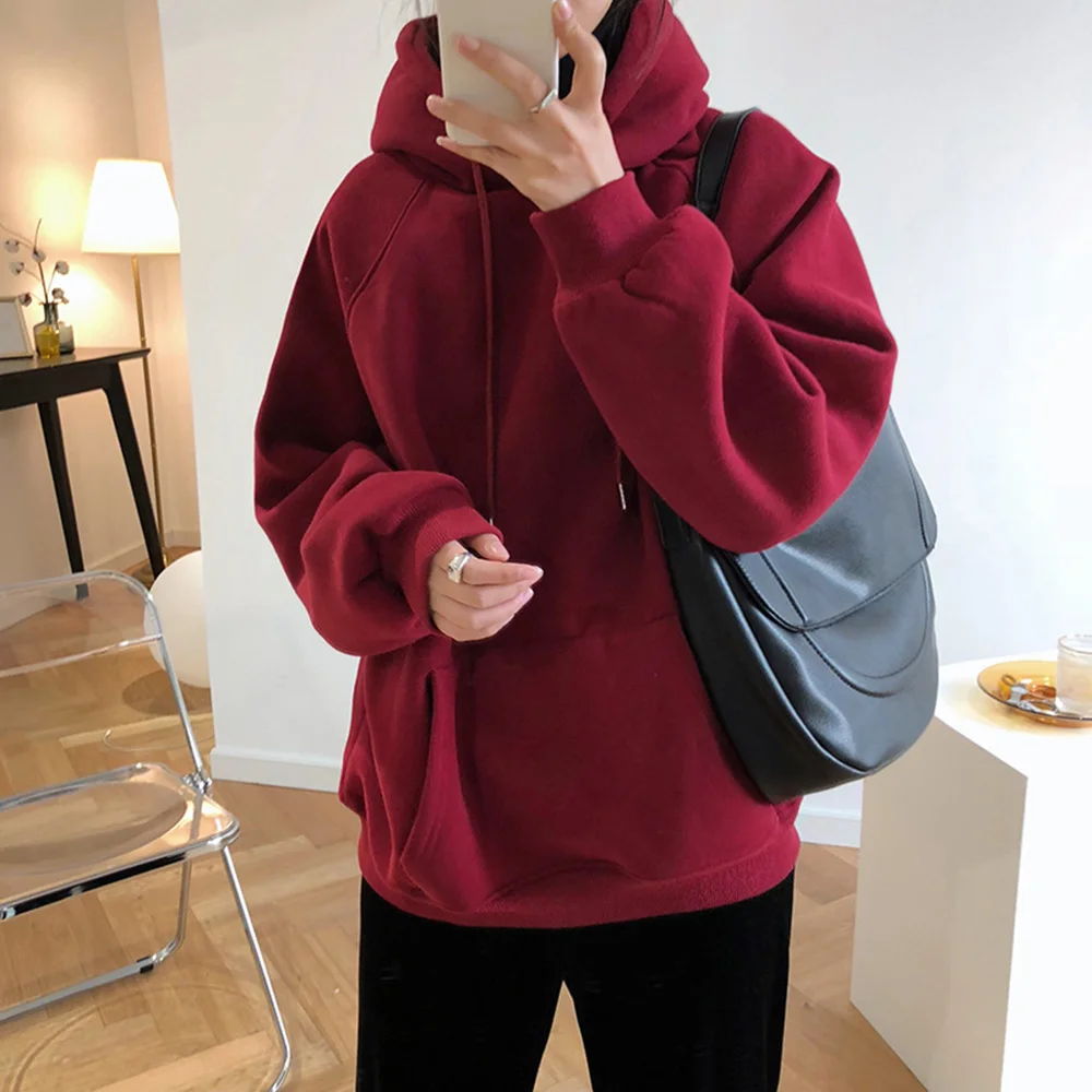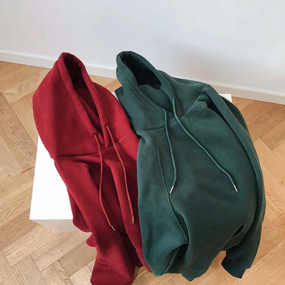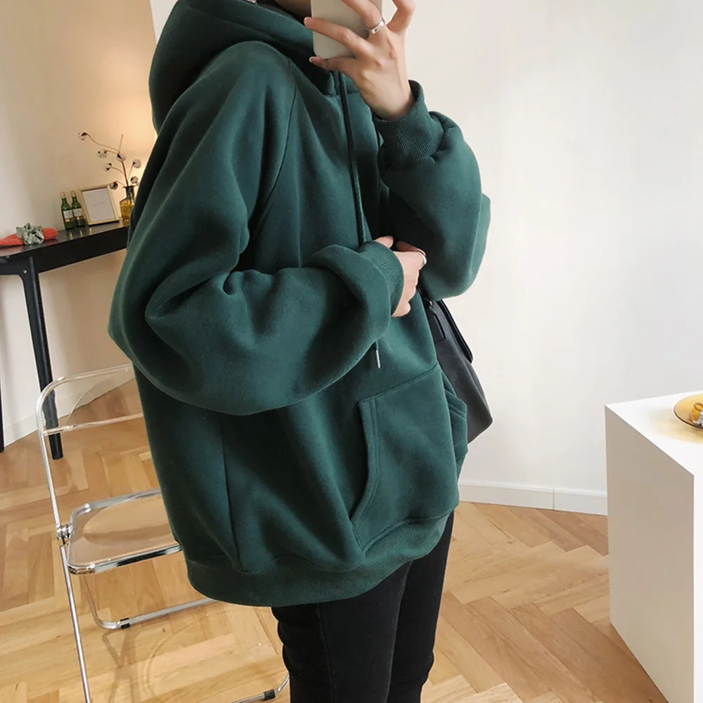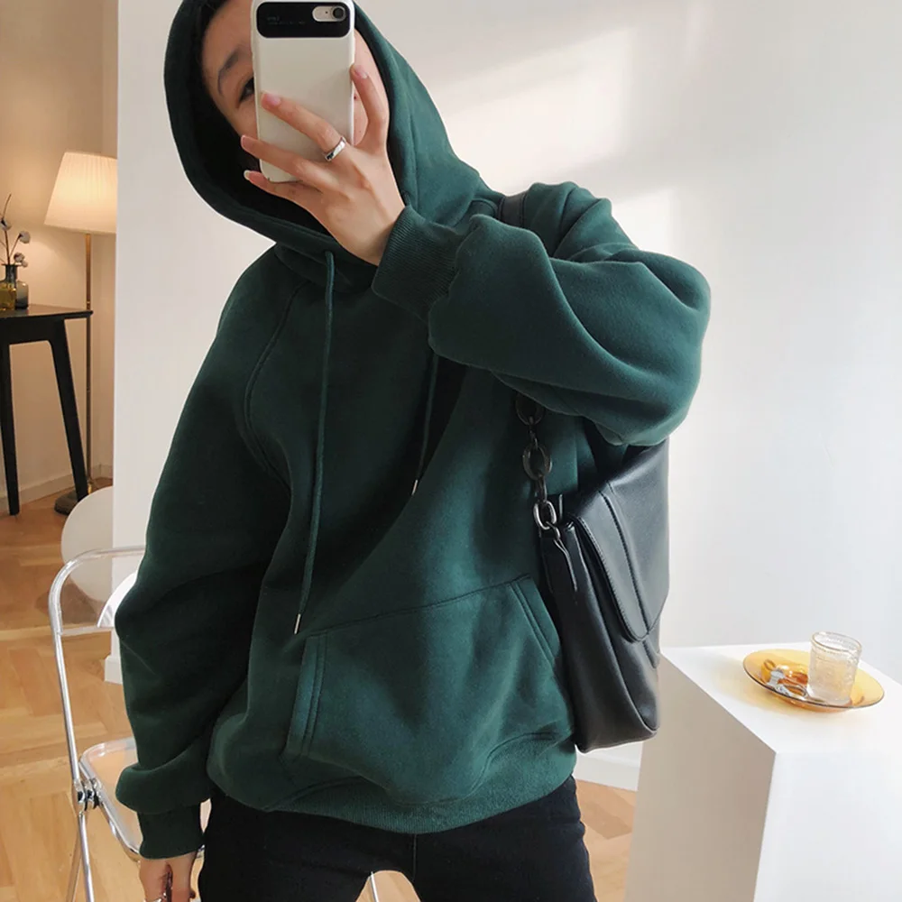 Осенняя Женская толстовка с капюшоном и длинным рукавом, корейский стиль, мягкая свободная толстовка, Повседневный пуловер, темно-красный, зеленый цвет, однотонные Бархатные Топы
