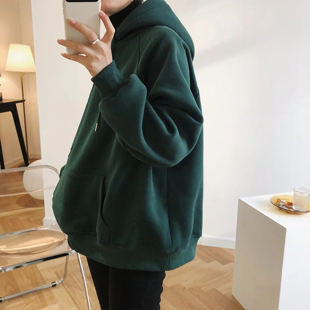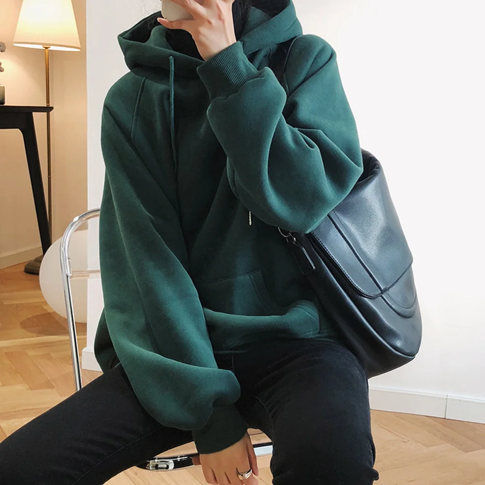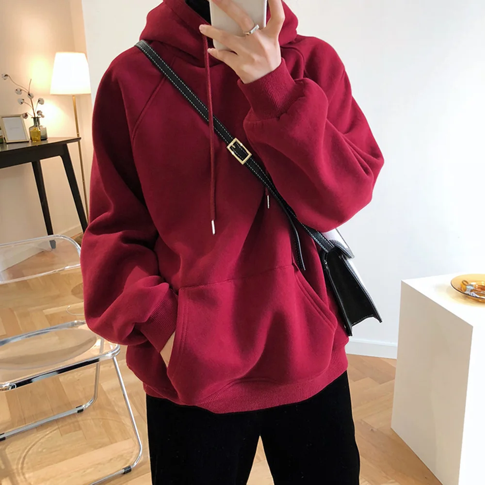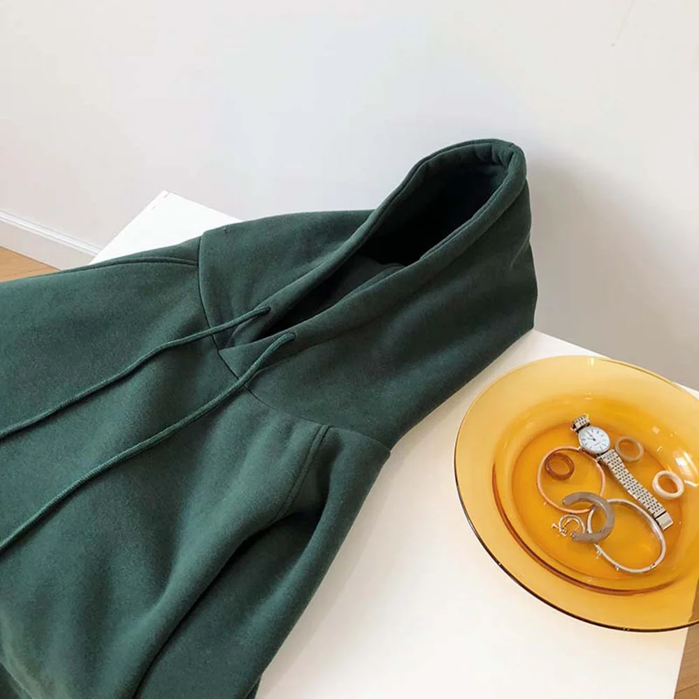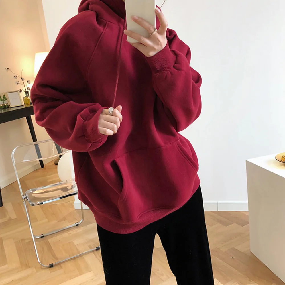 Осенняя Женская толстовка с капюшоном и длинным рукавом, корейский стиль, мягкая свободная толстовка, Повседневный пуловер, темно-красный, зеленый цвет, однотонные Бархатные Топы