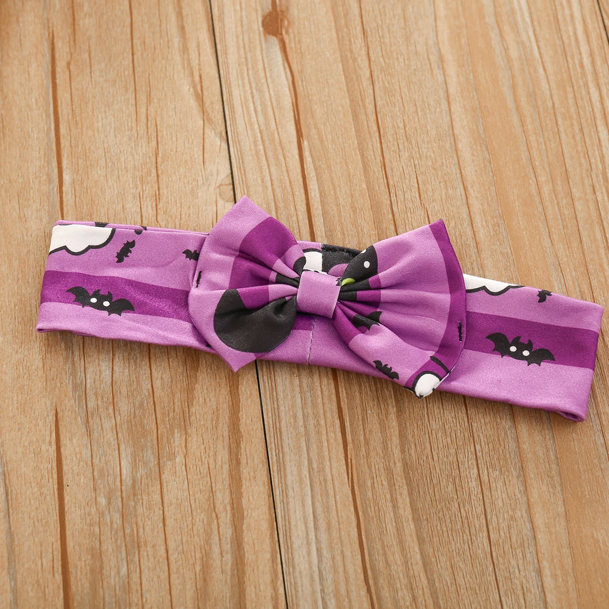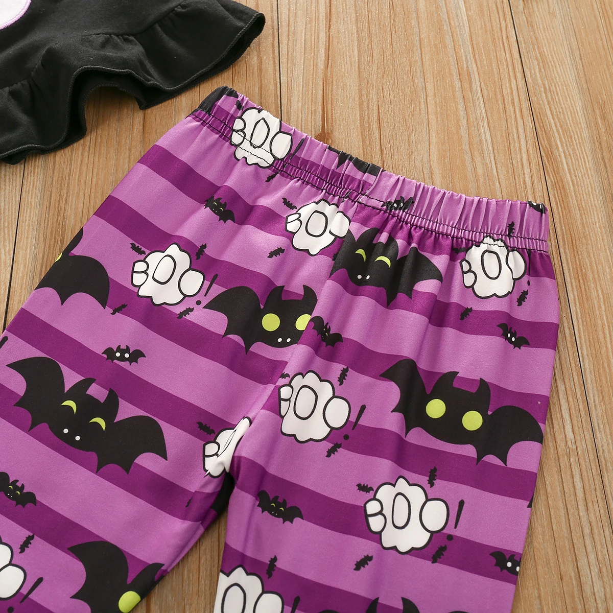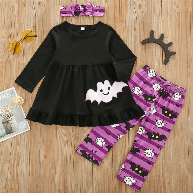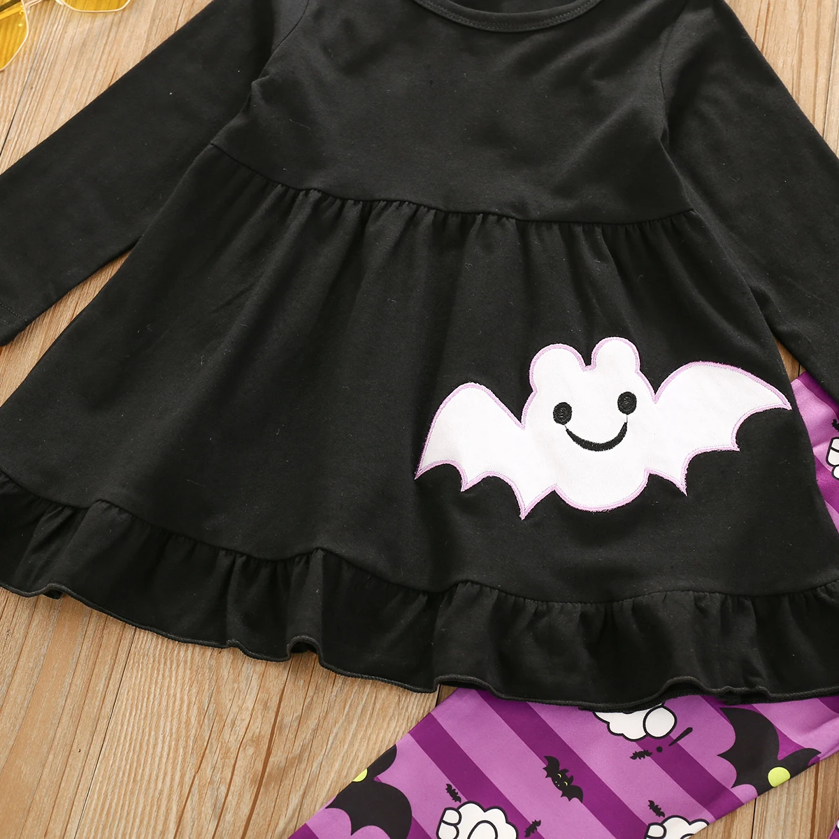 Комплект из 3 предметов для новорожденных девочек; Костюм на Хэллоуин; Топ с длинными рукавами и оборками с принтом летучая мышь + брюки с принтом + повязка на голову; Детская одежда для малышей