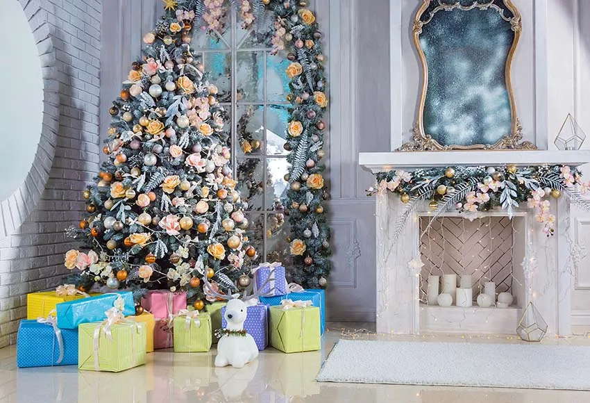 Фон для фотосъемки с изображением рождественской елки белого камина...