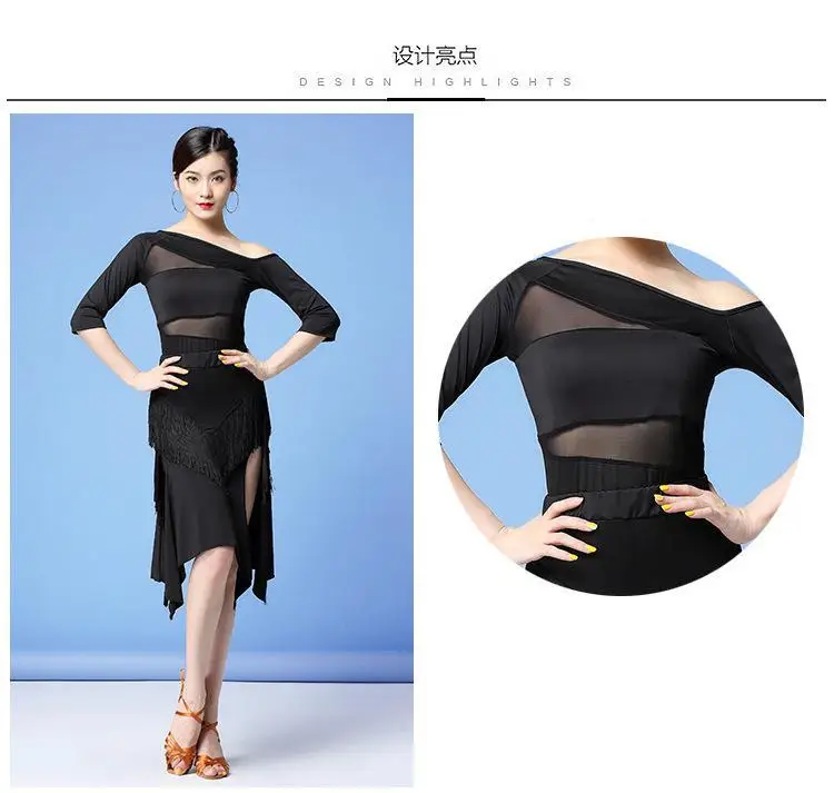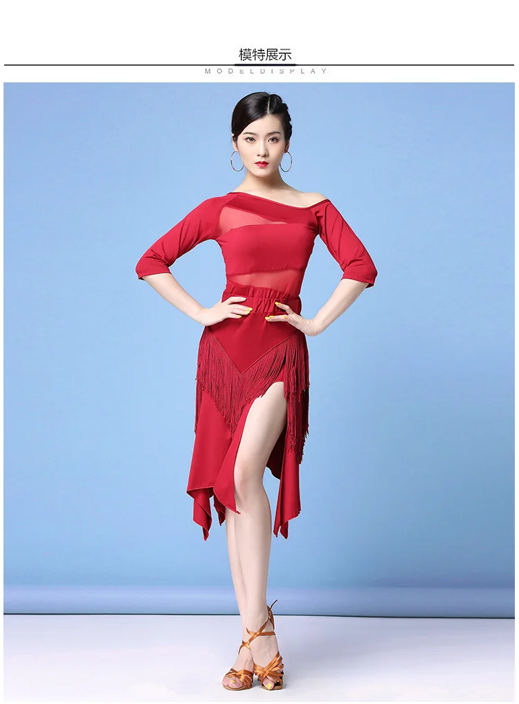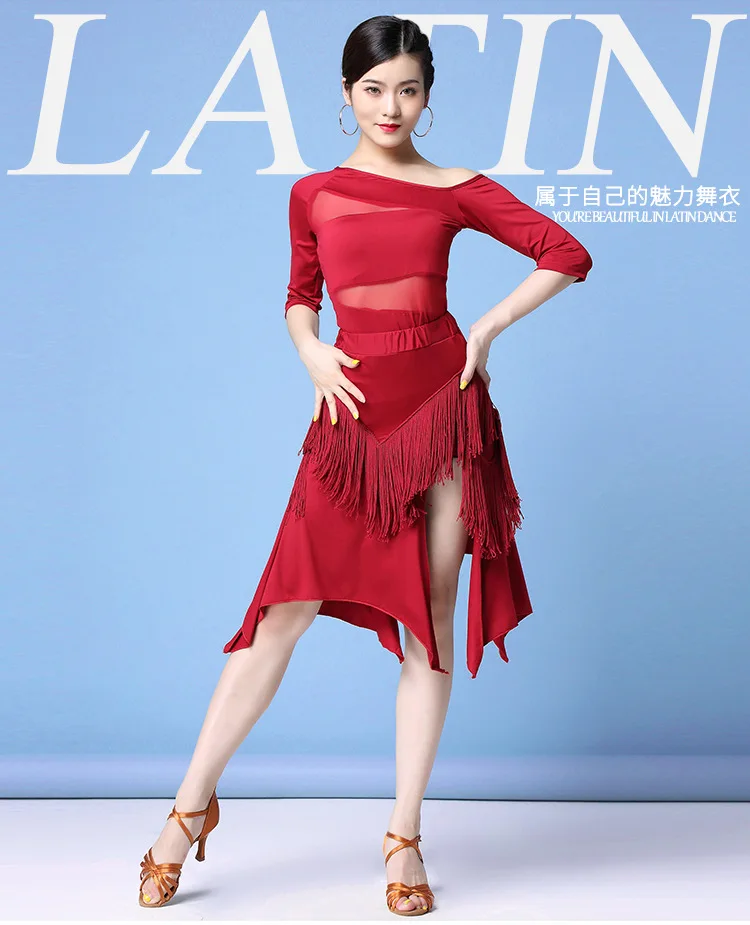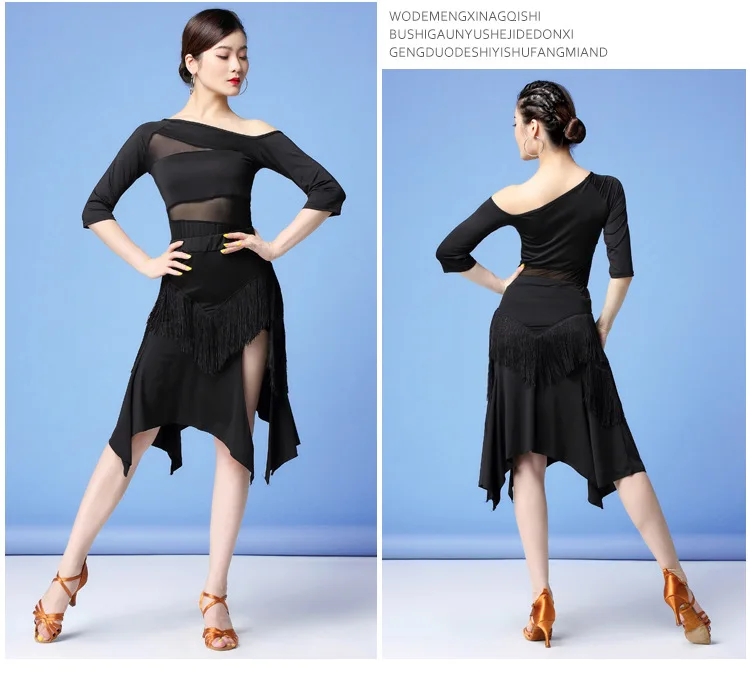 Новинка, женская одежда для бальных танцев, соблазнительные сетчатые платья из спандекса для сальсы и самбы со средним рукавом, платья из 2 частей для латиноамериканских танцев с бахромой, топ и короткая юбка