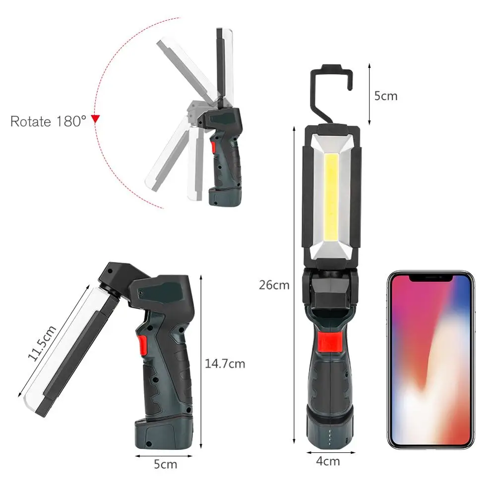 Особенности:COB светодиодный, яркий и энергосберегающий.С мощным магнитом на нижней стороне, вы можете прикрепить его к автомобилю или другой металлической поверхности, чтобы использовать как рабочий светильник, лампа для кемпинга.Поставляется с поворотным крюком на 360 градусов, что делает его отличным дополнением к любой мастерской или гаражу.Гибкий, головка 180 градусов регулирует угол луча в соответствии с вашими потребностями.Двойной интерфейс USB, интерфейс micro USB для зарядки рабочего света и другой выходной интерфейс для зарядки электрического устройства, например телефона.Помогите себе в поломке или экстренном использовании-черные выходы, аварийные ситуации на дорогах, штормы, общежития колледжа, светильник для ремонта автомобилей, подвесной светильник для палатки, SOS для выживания на открытом воздухе.Спецификация:Материал: АБС-пластикЦвет корпуса: черныйСветильник: белый + красныйТип переключателя: кнопкаСветильник источник света: COB + светодиодныйБатарея: Встроенная перезаряжаемая литиевая батарея (фонарик 18650)Режим зарядки: микро-usb зарядка поддерживает выходную мощность (перезаряжаемый фонарик)Режимы яркости: 5 режимов (светодиодный светильник/COB белый высокий светильник/COB белый низкий светильник/COB красный светильник стробоскоп) (Длительное нажатие кнопки переключения входит в режим Красный светильник)Размеры: 26,5 см x 4 см x 4,5 смВес лампы: 240 гПосылка включает в себя:1 x светодиодный фонарик1 х USB кабель для зарядки
