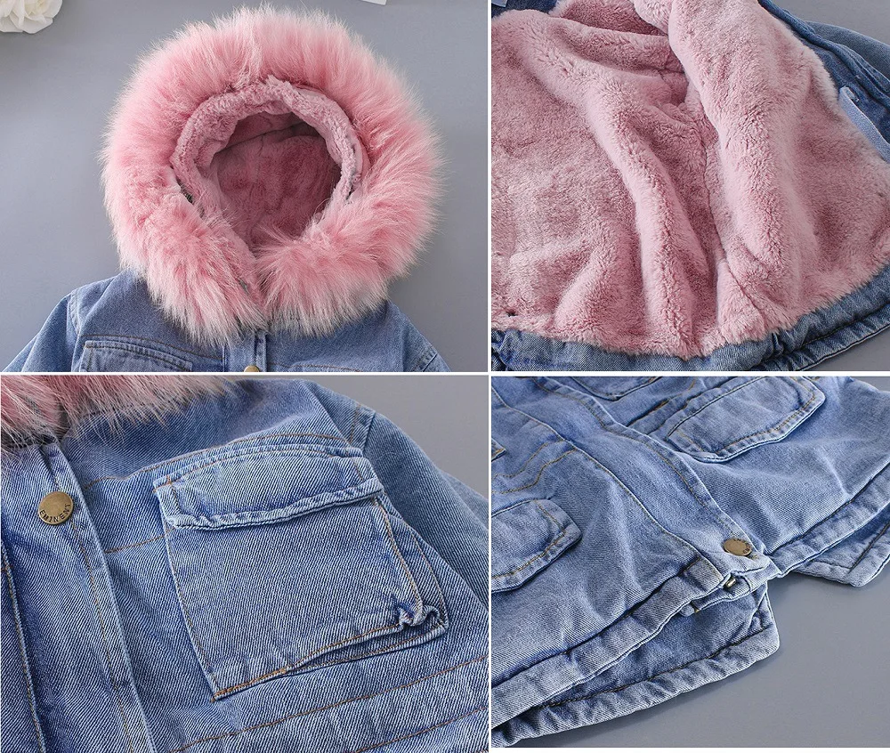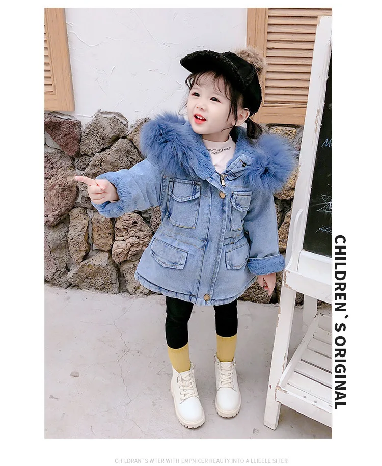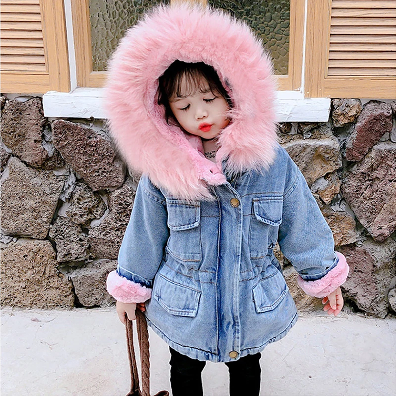 Детская джинсовая куртка с меховым воротником и капюшоном, для девочек
