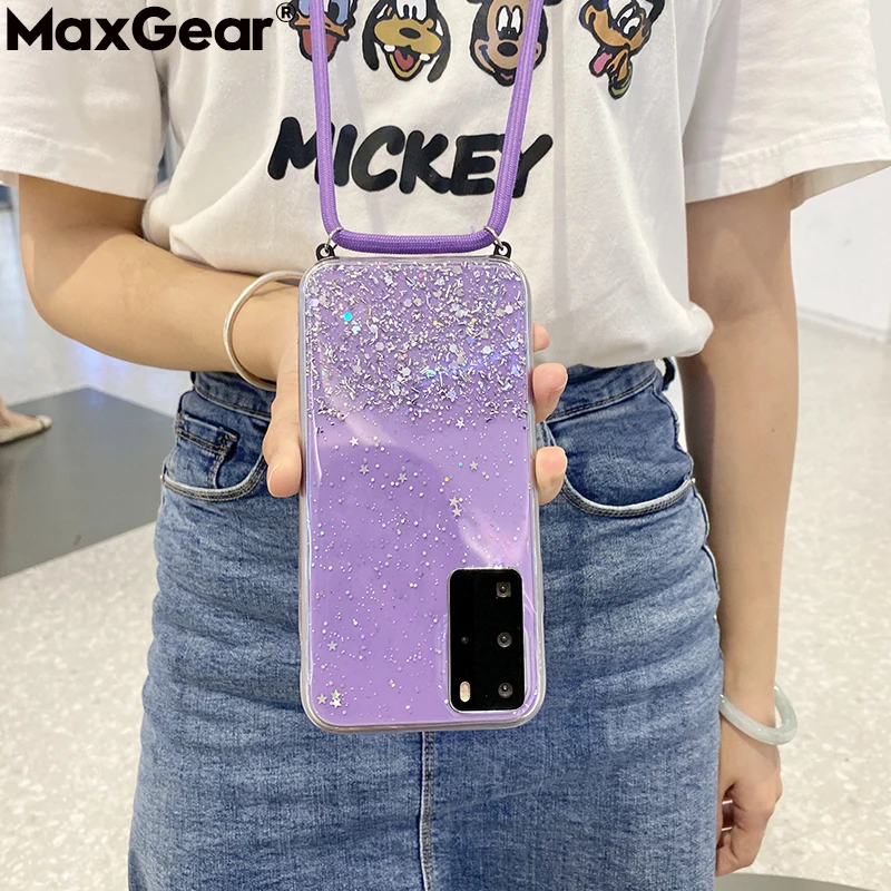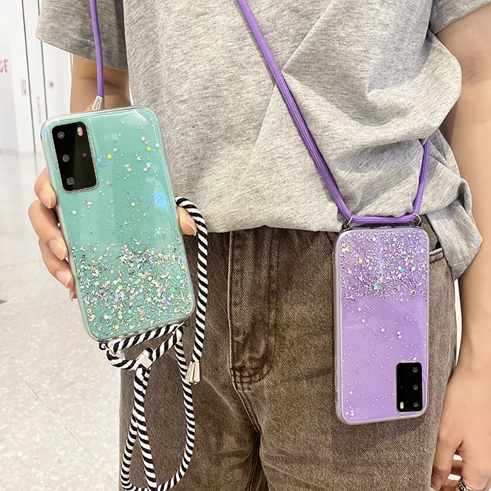 Блестящий чехол со звездами и блестками для Huawei Honor 8 9 Lite 9A 8A 8X 30 Pro X10 V30 Nova 5T 4 7 3, чехол с ремешком на шею