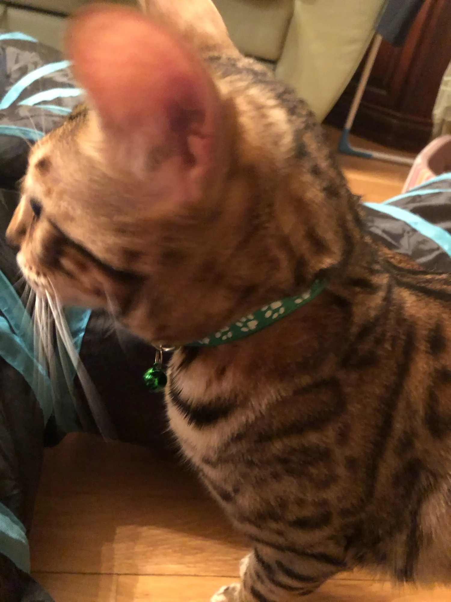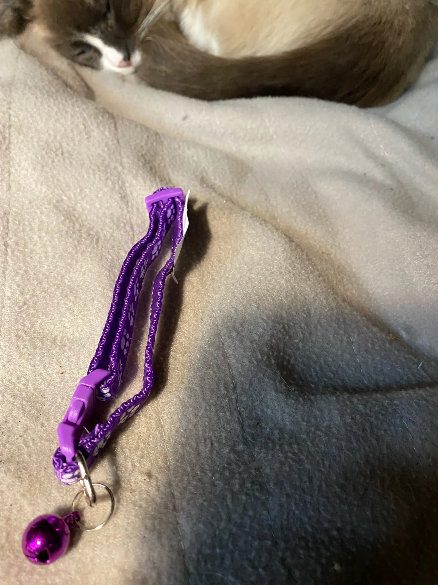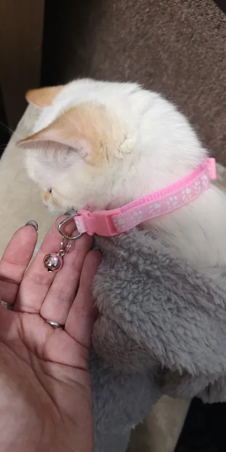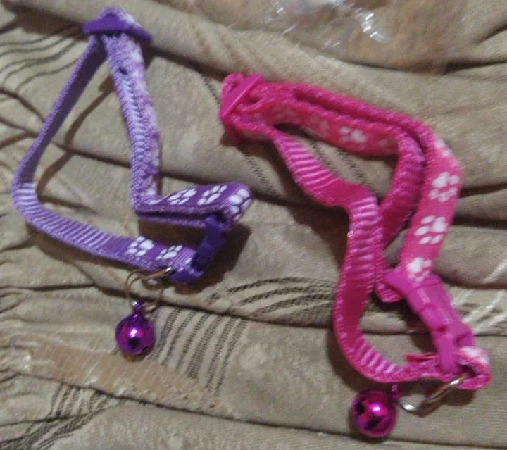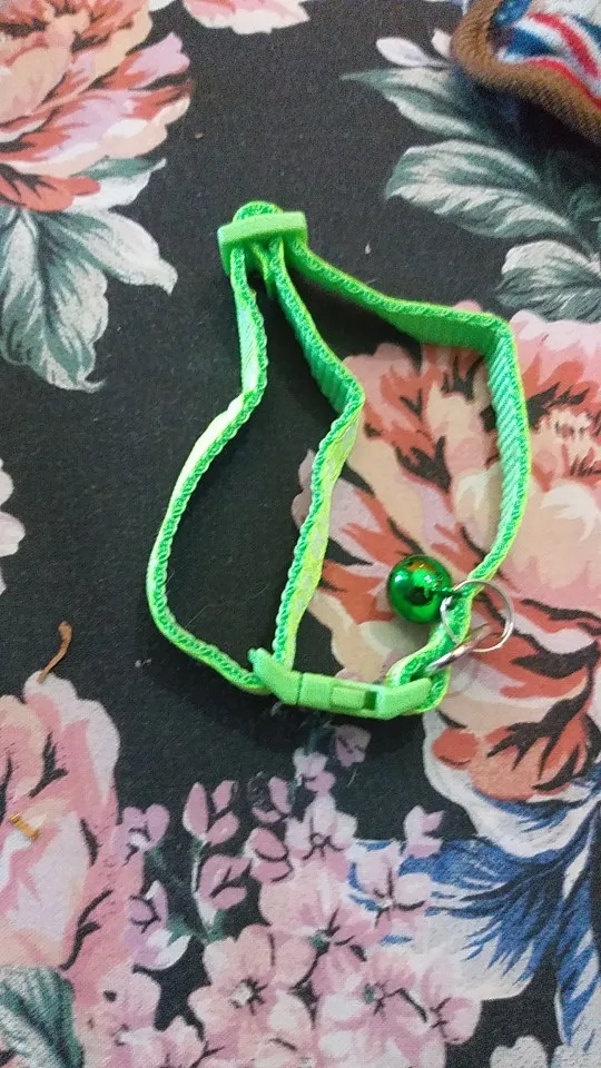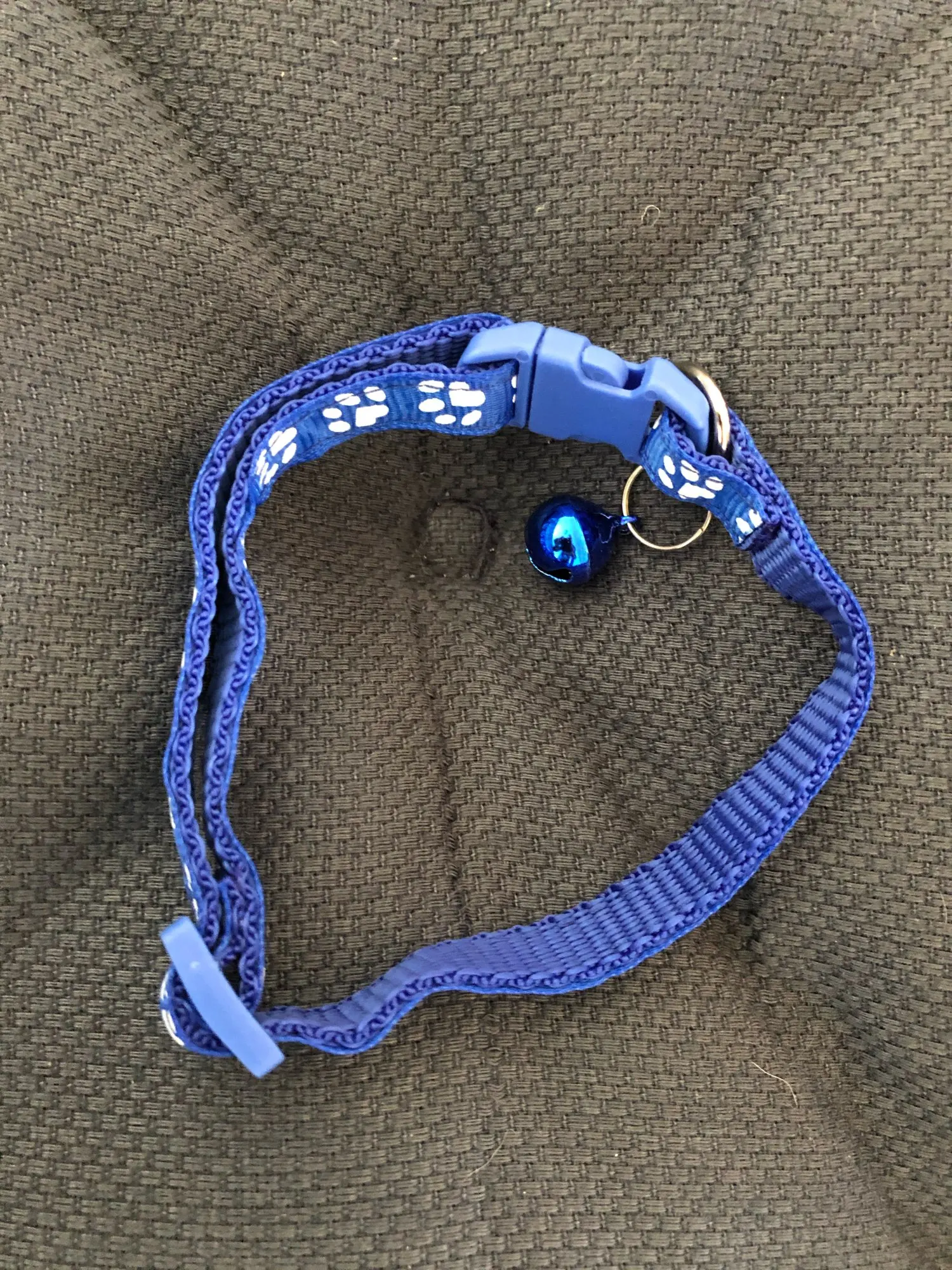 Ошейник точно как на фото, длина регулируется, колокольчик не очень громкий, не надоедливый. Мне понравился, Аське не очень. Пытается снять.