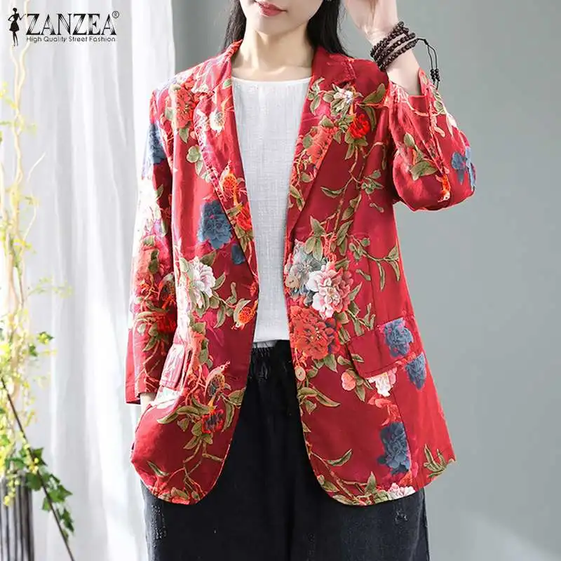 Кафтан ZANZEA 2021, весенний пиджак, Женское пальто с принтом, кардиган на одной пуговице, женское цветочное пальто, Повседневная Туника