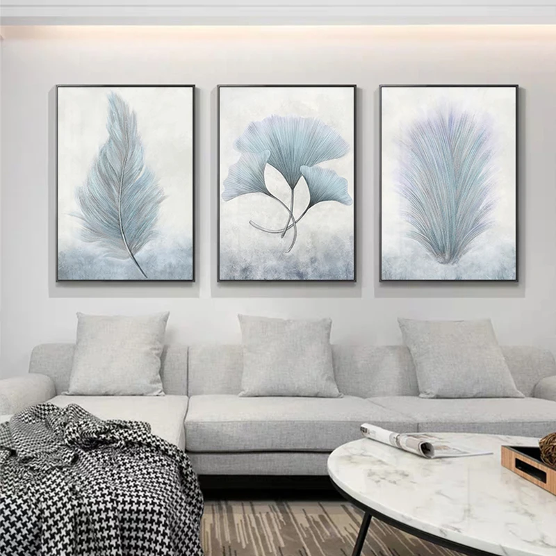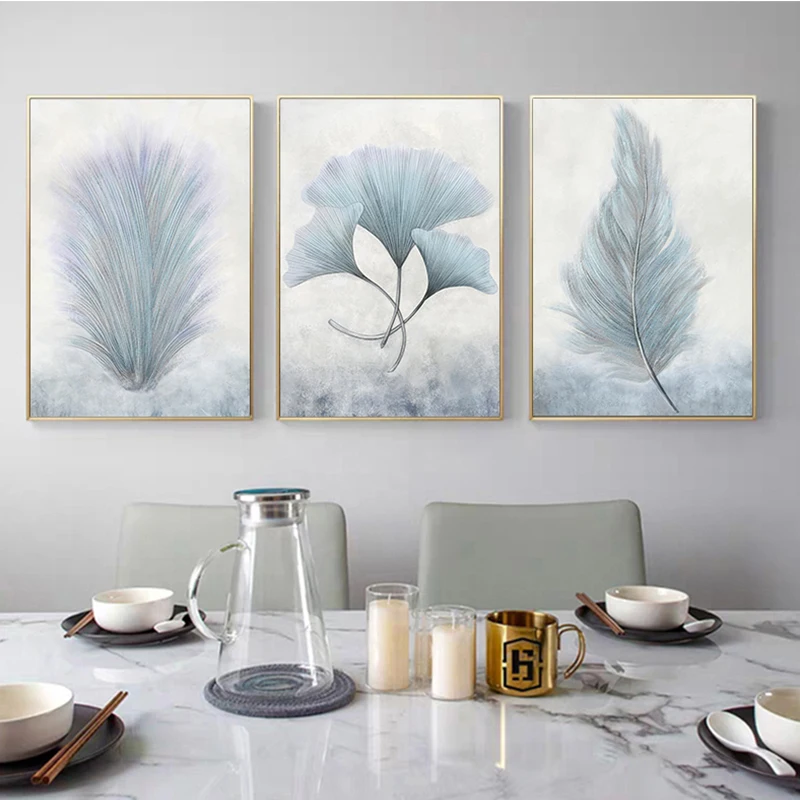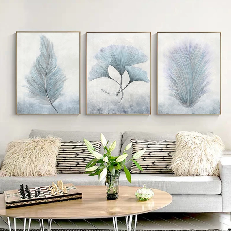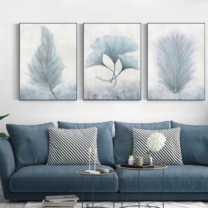 Скандинавский постер с белыми перьями и листьями, абстрактный голубой холст, настенная живопись, Современная HD картина, украшение для гостиной