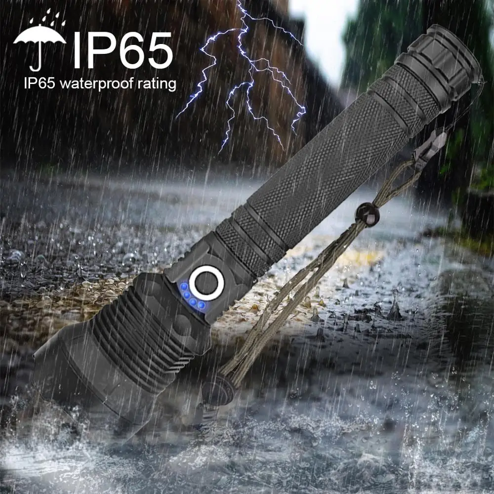 Мощный светодиодный фонарик использует лампу XHP70.2 светодиодный с максимальной выходной мощностью до 65000 люмен Увеличьте 1*18650 или 1*26650 отсек для перезаряжаемой батареи, чтобы увеличить время работы. Дисплей емкости батареи, телескопический зум Микро-usb для компьютера USB, автомобильный USB, USB-разъем для зарядки, зарядный фонарик Изготовлен из надежного алюминиевого сплава класса aero HAIII, армейского класса, твердый анодированный Водонепроницаемость соответствует IPX-6, водонепроницаемость, можно использовать в дождливую погоду, но нельзя класть в воду Подходит для работы, охоты, альпинизма, рыбалки, кемпинга и активного отдыха и т. д. Ударопрочность до 2 метров