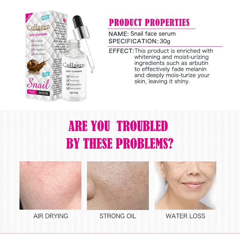 Эффективная увлажняющая Блокировка воды, мягкая и сияющая жидкая эссенция улитки может мгновенно обеспечить много влаги для кожи,Благодаря своим уникальным ингредиентам кожа легко впитывает влагу и не оставляет липких ощущений, предотвращая потерю воды,Так что вода-недостаточная кожа мгновенно пополняет влагу и увлажняет.