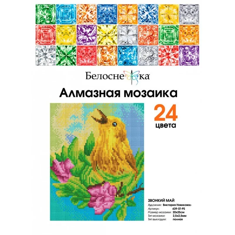 Прекрасные наборы для желающих попробовать себя в новом виде творчества, из полотна получается красивая мерцающая картина. Все сюжеты жизненные и авторские, разработаны по картинам современных российских художников. В комплект входят квадратные ограненные акриловые камни, которые расфасованы по цветам, на пакетах имеется наклейка с условным обозначением и номером. На холсте напечатана четкая цветная схема, поверх которой нанесен качественный клеевой слой, сверху клеевой слой защищает прозрачная пленка. Квадратная форма алмазных камней позволяет аккуратно заполнить картину и без единого пробела. Техника алмазной мозаики достаточно проста и увлекательна. Готовую работу можно смело ставить в раму и вешать на стену. В солнечный день алмазная мозаика вас прекрасно удивит своим блеском и переливанием. Комплектация: 1. Основа картины - холст с нанесенной схемой и клеевым покрытием 2. Комплект квадратных камней с огранкой 2,5*2,5 мм. 3. Пластмассовый лоток с ячейками 4. Пинцет металлический 5. Дополнительный тюбик клея 6. Листовка-ключ к схеме Характеристики: Художник – Виктория Новикова Серия - птицы Размер – 20*25 см. Тип выкладки – 100% заполнение Форма камней - квадратные 2,5*2,5 мм, 9 и 13 граней Количество цветов - 24 Упаковка – прозрачный пакет с кнопкой Торговая марка – Белоснежка Страна производства - Китай